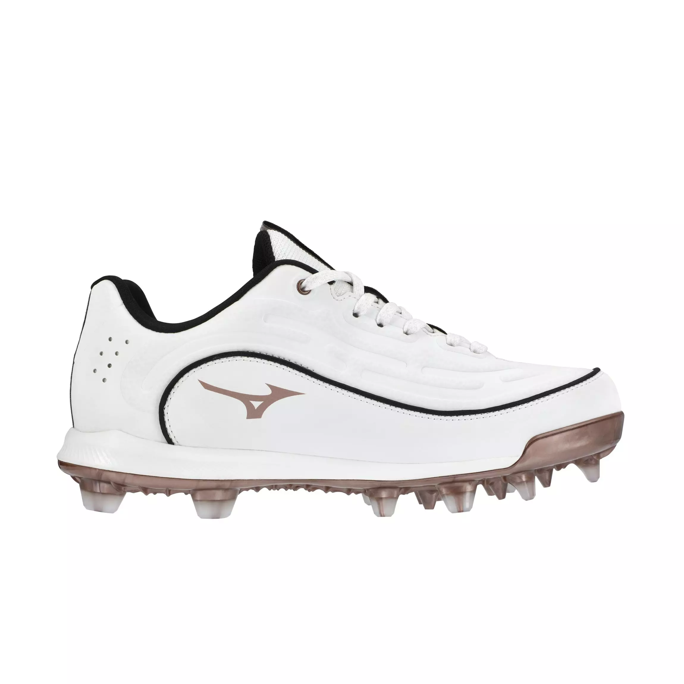 The 9-Spike Mizuno Advanced Finch Elite 6 TPU "White/Rose Gold" Women's Softball Cleat is Gender Engineered for softball-specific movements. Translucent I-Shaped TPU studs provide a unique accent that also increases traction on multiple surfaces. The ribbed construction of the Mizuno C-Flex Outsole is a combination of enhanced stability, flexibility, and traction, while also reducing stud pressure to provide superior comfort during long games. The new 2 layered insole provides maximum step in comfort.Features