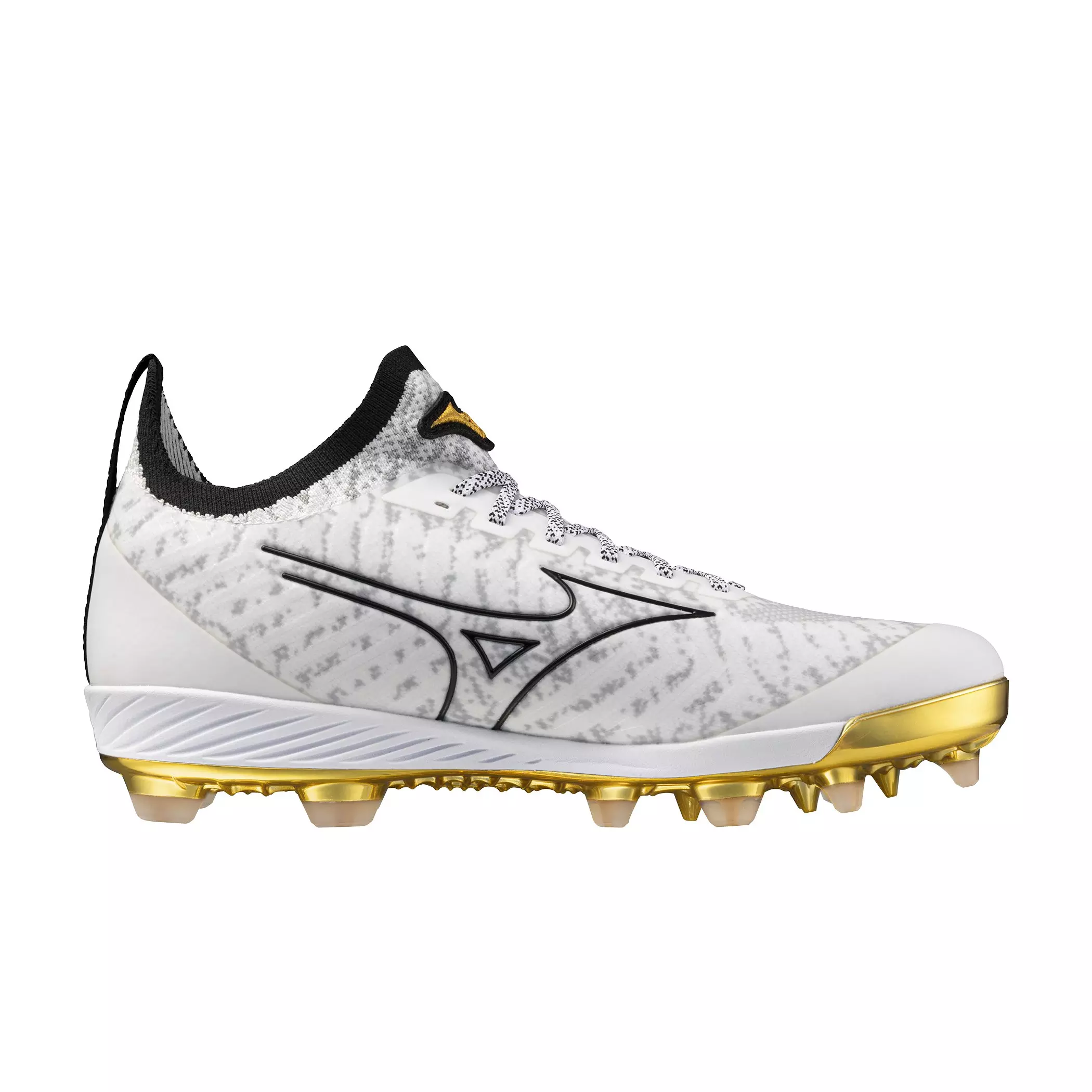 Step onto the field with confidence in the Mizuno Pro TPU "White/Gold" Men's Baseball Cleat, heralded as the best molded cleat in the world and the pinnacle of lightweight performance. This cleat redefines excellence with a water-resistant coating over its knit upper, ensuring a dry and comfortable fit while providing structural support without compromising overall flexibility. Borrowing innovation from Mizuno's renowned running shoes, the full-length Mizuno Enerzy® midsole and insole deliver unmatched cushioning and responsiveness. The 2-Way Grip heel liner prioritizes reducing heel slippage, allowing for quick take-offs and optimal agility. Slightly lighter than its metal cleat counterpart, the TPU studs on this cleat evenly distribute the athlete's body weight, reducing hot spots caused by cleat pressure. Whether on grass or turf, the Mizuno Pro TPU cleat stands as the ultimate choice for those seeking a perfect blend of lightweight design, comfort, and elite performance on any ball field. *Wide foot order true to size. Standard foot order half size down. Example: Standard size 10 needs to order 9.5.Features