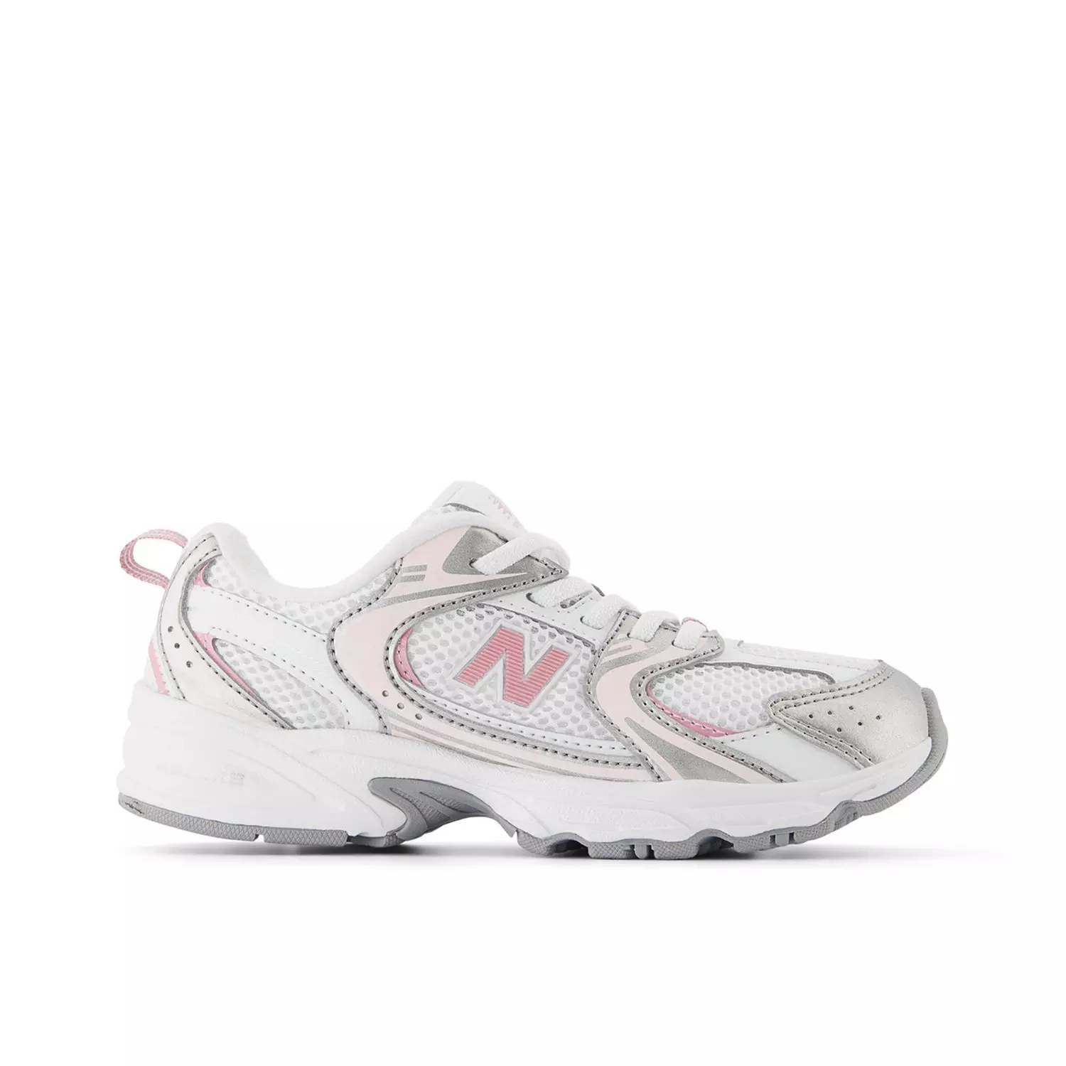 The New Balance 530 "White/Pink" Grade School Girls' Shoe revives one of the brand’s most iconic 1990s designs with a fresh update. A clean white upper is accented with soft pink overlays, blending retro inspiration with a lightweight, supportive build. Its nostalgic silhouette delivers all-day comfort for school, play, and everything in between.