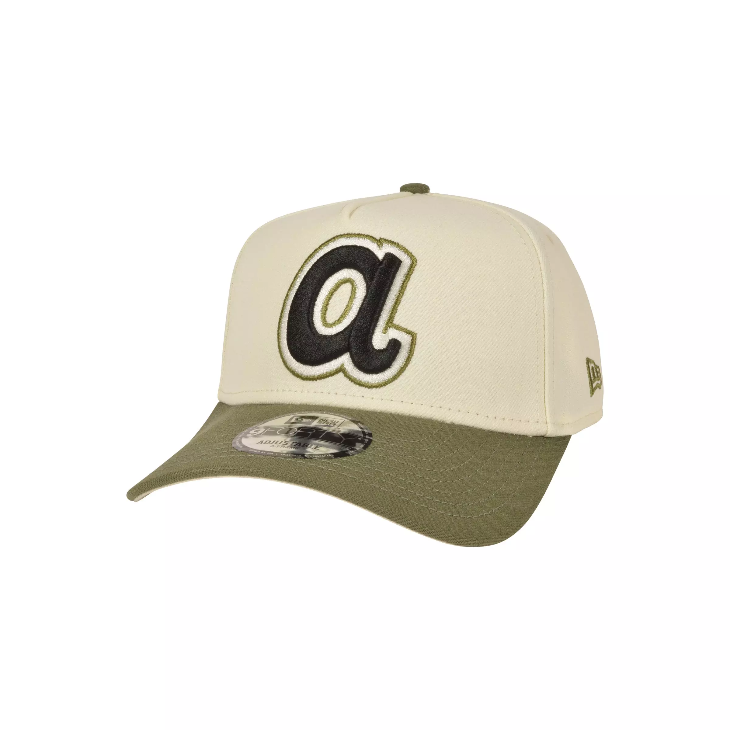 Show team pride in the New Era Atlanta Braves 9FORTY A-Frame Varsity Snapback Hat-Olive. The structured A-frame crown and curved visor deliver a confident, comfortable feel, while the bold Braves logo brings a classic varsity vibe to everyday outfits.