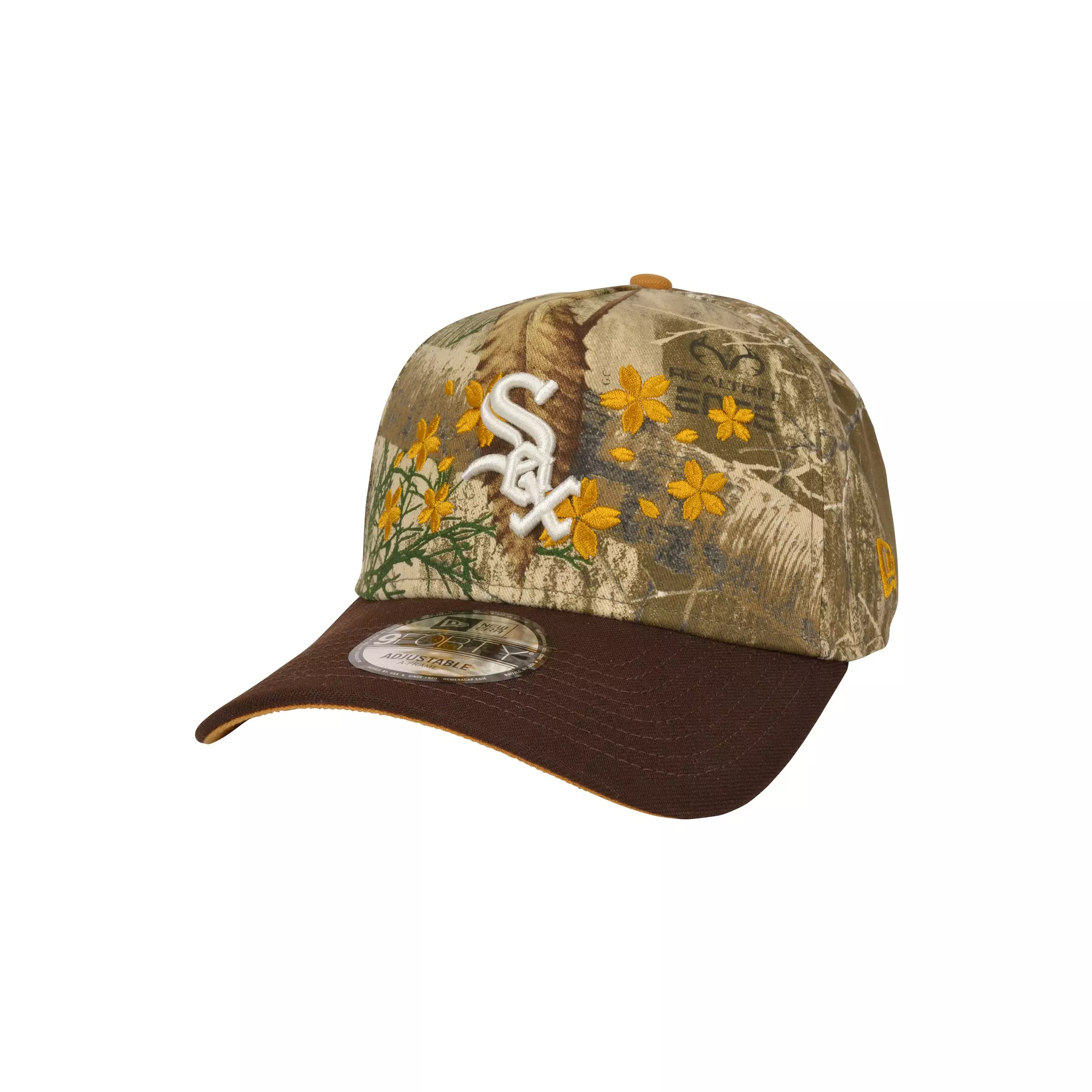 Make a statement with the New Era Chicago White Sox 9FORTY A-Frame Cherry Blossom Snapback Hat-Black/Tan. The structured yet flexible crown gives a snug, comfortable fit while the Cherry Blossom pattern and bold White Sox logo add standout team style.
