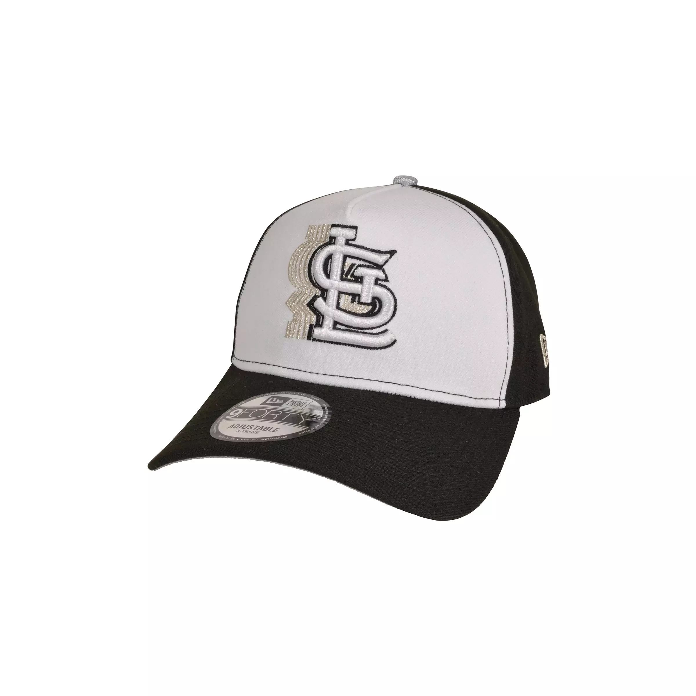 Show your team pride with the New Era St. Louis Cardinals 9FORTY A-Frame Snapback Hat-Black/White/Silver, featuring a structured A-frame crown and bold front Cardinals patch. The pre-curved visor delivers instant, easy wear, while the sleek metallic-inspired color accents elevate everyday looks.