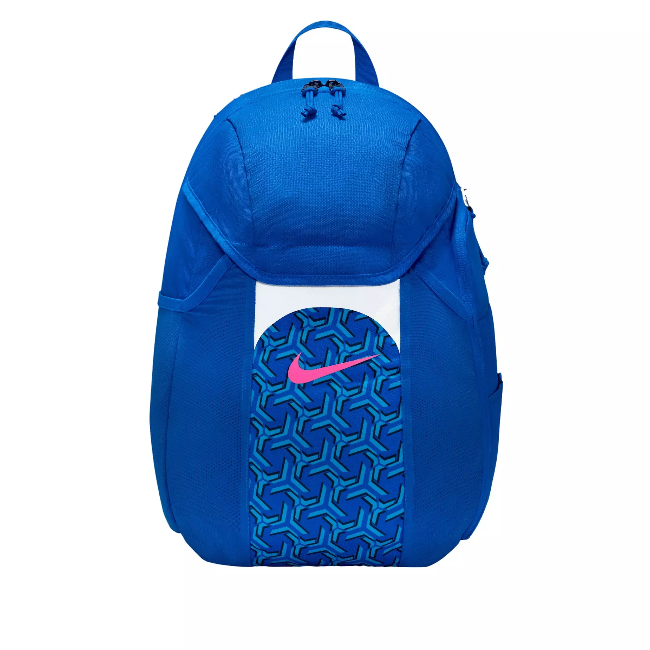 The weather doesn't keep you from practice, and it shouldn't keep you from having dry gear. Whether resting on the ground or hanging on a fence, this blue Nike Academy Team (30L) Backpack handles less-than-ideal game and practice conditions—and holds your ball in the front pocket. The rain fly features Nike Storm-FIT technology to help provide extra coverage from the elements, while mesh on the bag allows breathability and ventilation on those good-weather days.Features