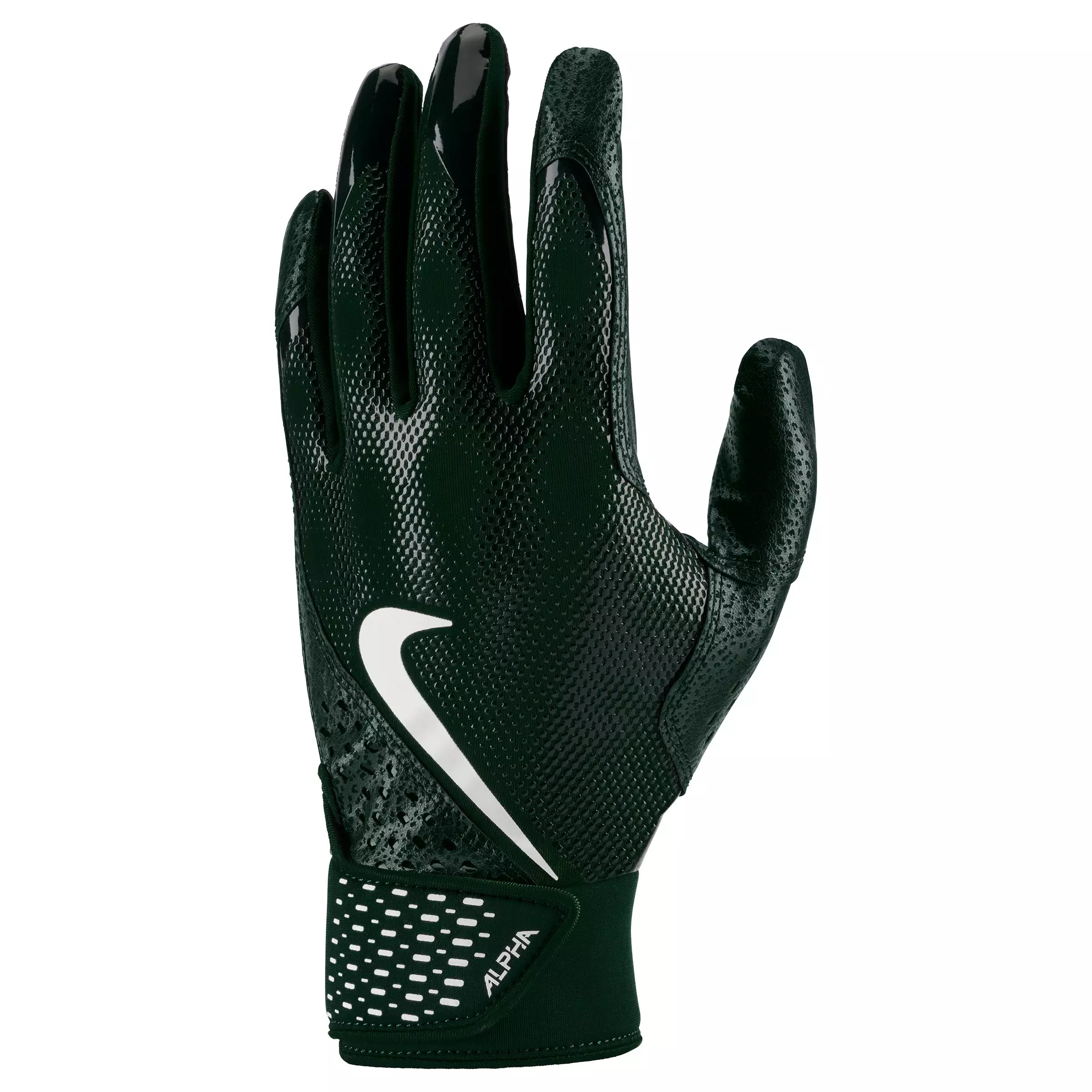 From the batting cages to the batter's box, these durable Nike Adult Alpha Baseball Batting Glove are essential. Textured, premium synthetic leather palm enhances your grip, while the back of the hand overlay provides flexibility and support where you need it.Features