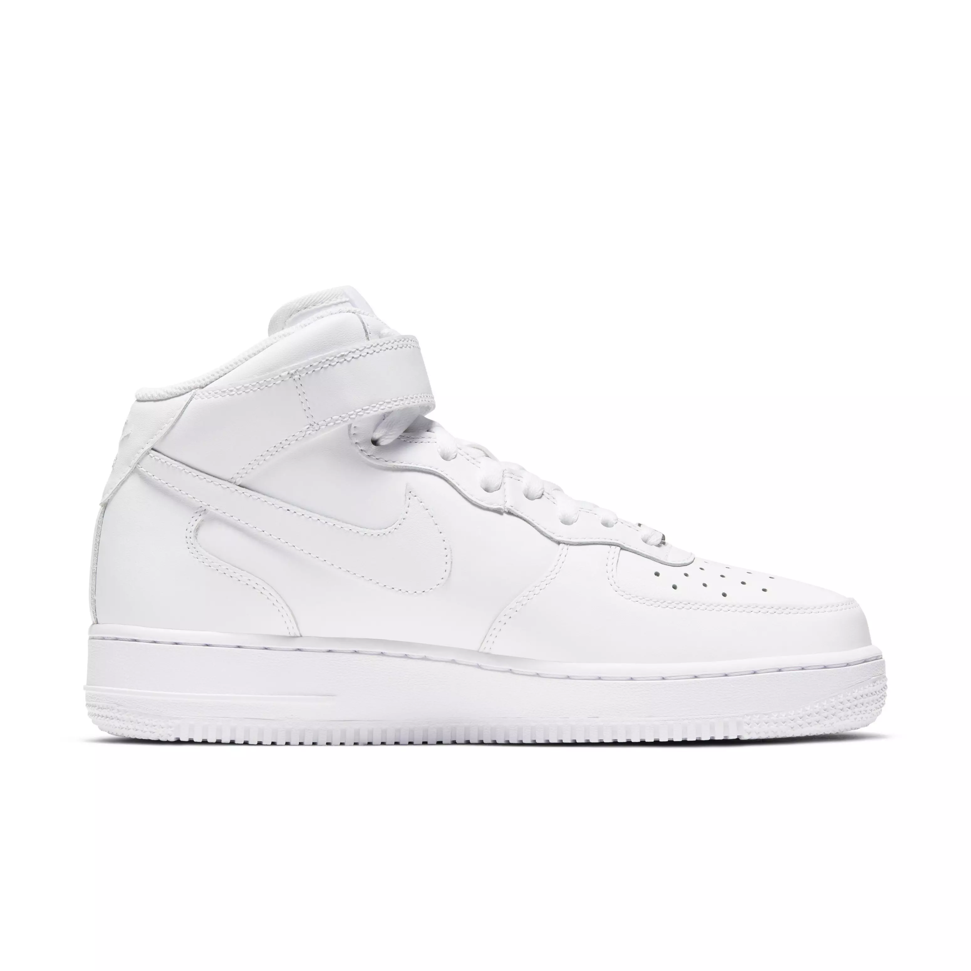 The Nike Air Force 1 '07 Mid "White/White/White" Women's Shoe is everything you love best: crisp overlays, bold accents and the perfect amount of flash to let you shine. The padded, mid-height collar with classic hook-and-loop closure mixes style versatility with heritage b-ball comfort while perforations on the toe keep you cool.