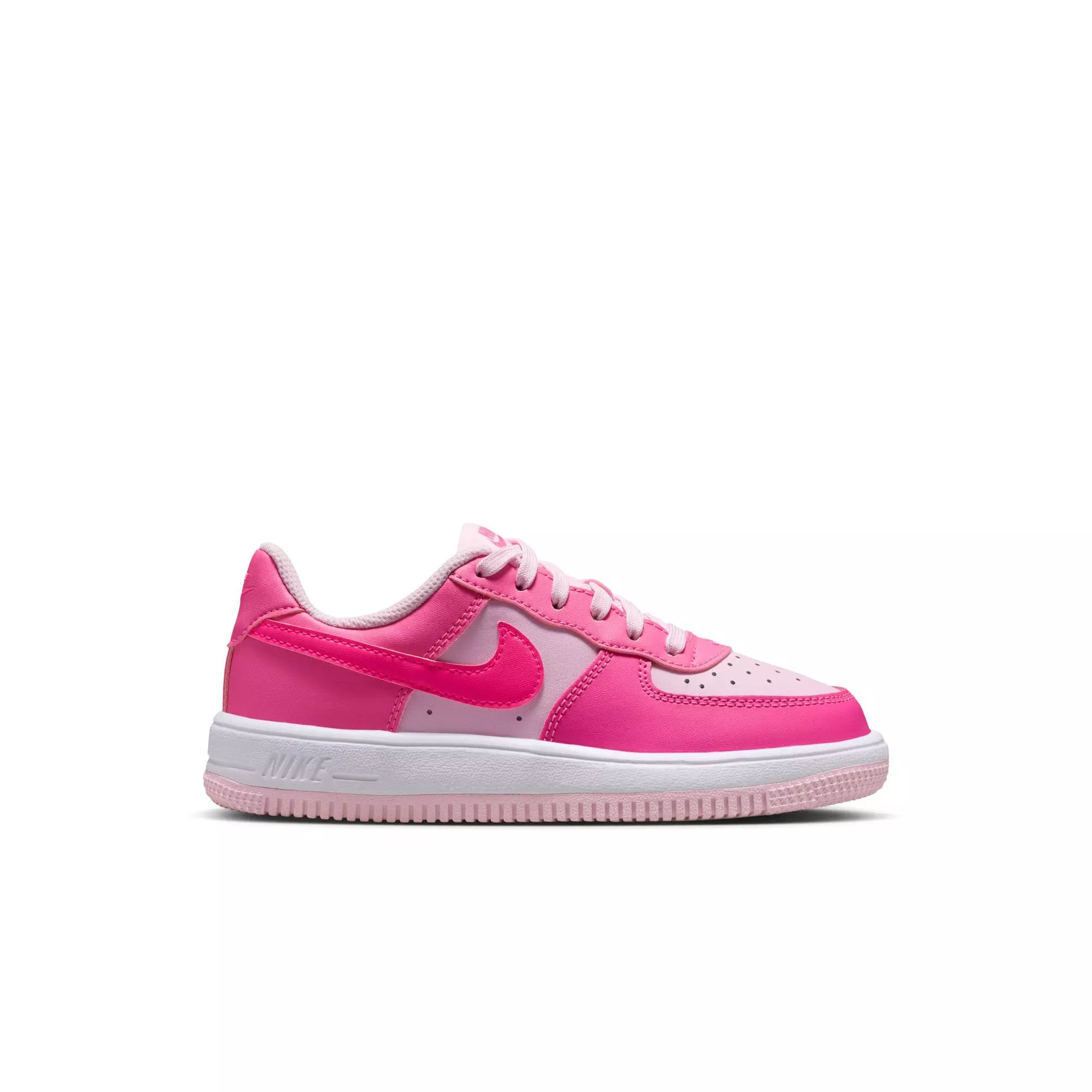 The Nike Air Force 1 Low "Pinksicle/Hyper Pink/Pink Foam/White" Preschool Girls' Shoe brings classic hoops style to everyday play. A durable upper, soft cushioning and a rubber outsole deliver comfort and traction for busy days, from classroom to playground. The bright pink palette adds a fun pop to any outfit.