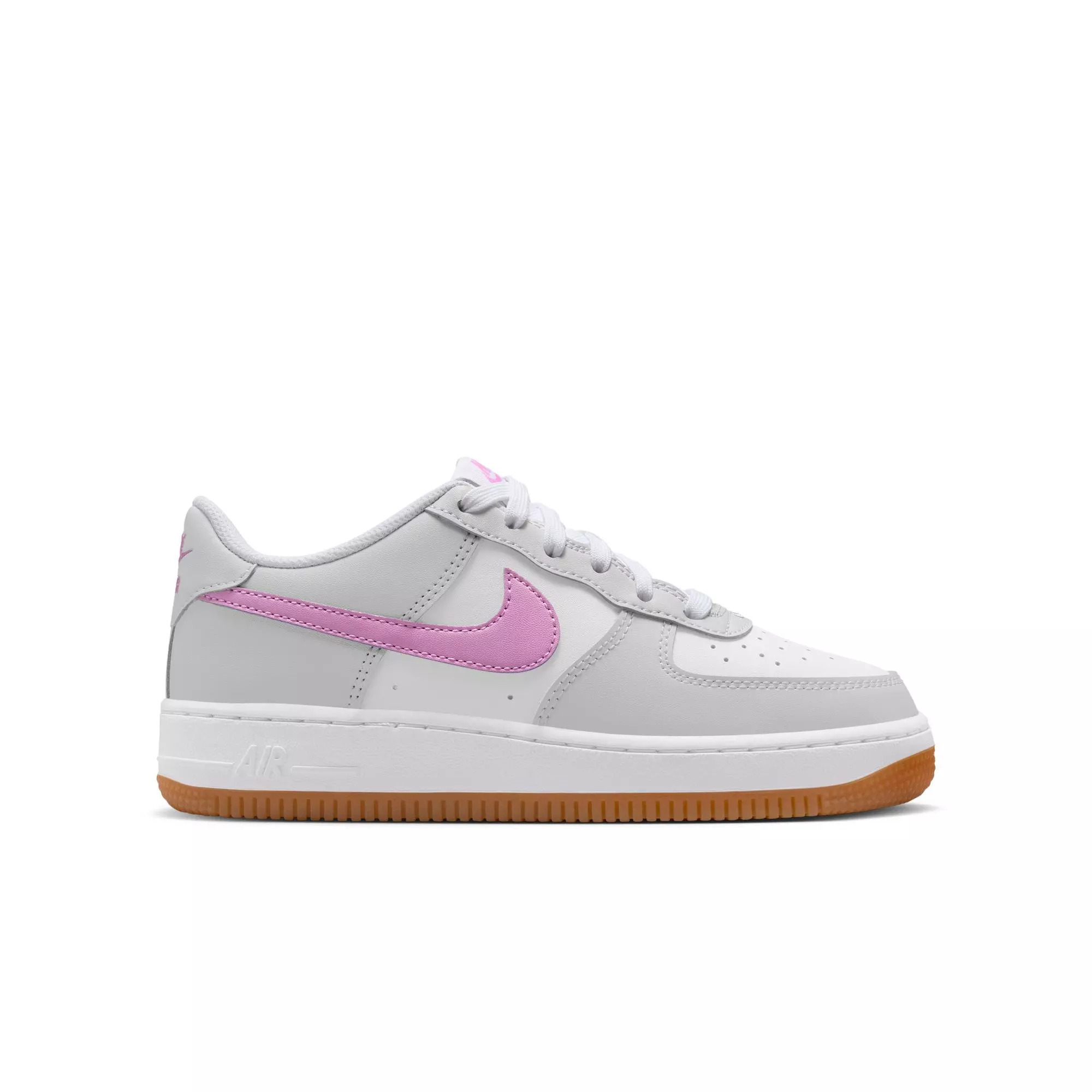 Kick it in comfort in the Nike Air Force 1 "White/Lt Magenta/Off-White/Gum Med Brown" Grade School Girls' Shoe. The feel of classic leather and details that made this shoe an icon are sure to make your sneaker style stand out on the street.