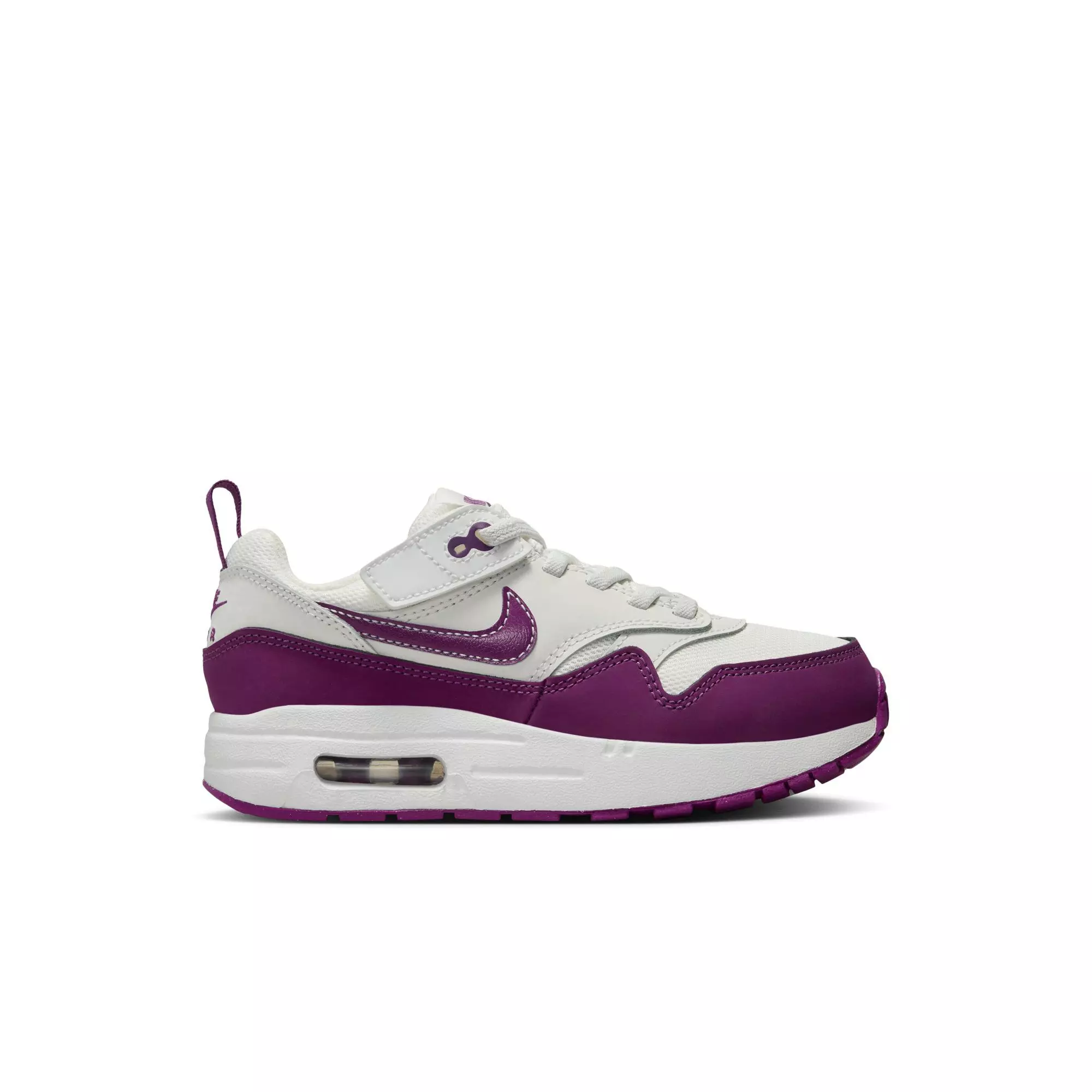 Made for kids (and their squirmy feet), these Nike Air Max 1 EasyOn "Summit White/Viotech/White" Preschool Girls' Shoes have a Nike EasyOn system that makes putting them on a breeze. The laces are just for show—the top loop combines with a hook-and-loop strap to create a wide opening while still looking like traditional laces.