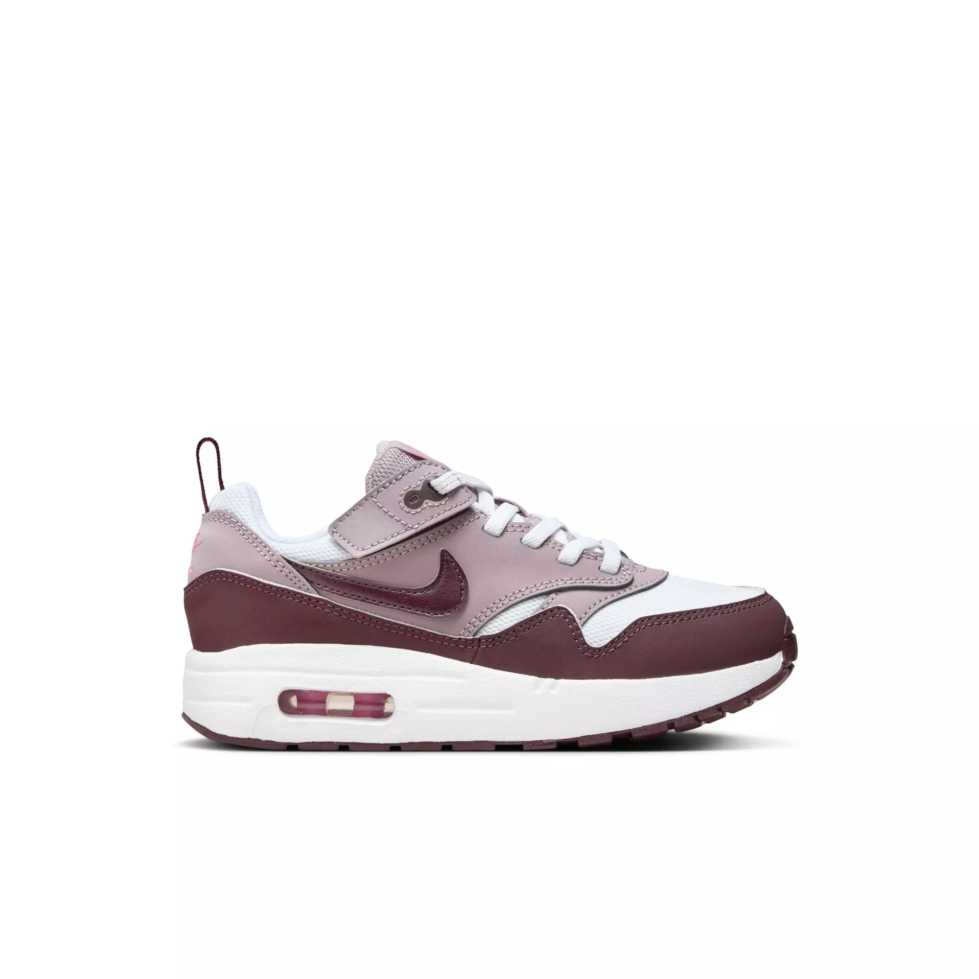 Made for kids (and their squirmy feet), these Nike Air Max 1 EasyOn "White/Burgundy Crush/Lt Violet Ore" Preschool Girls' Shoe have a Nike EasyOn system that makes putting them on a breeze. The laces are just for show—the top loop combines with a hook-and-loop strap to create a wide opening while still looking like traditional laces.Features