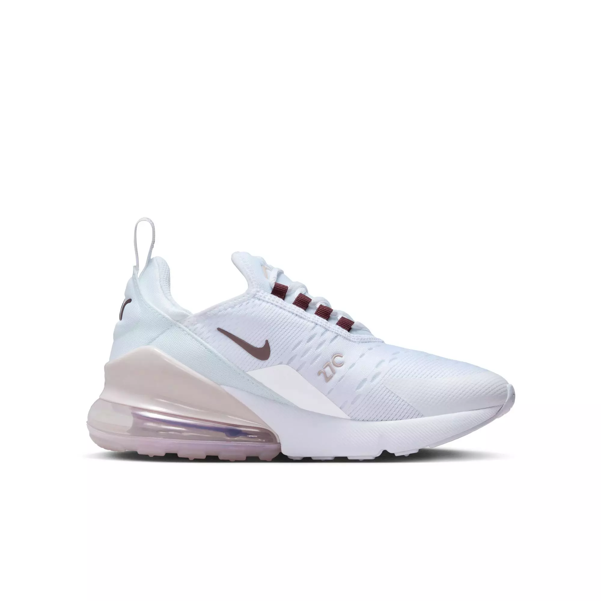 Nike Air Max 270 "White/Burgundy Crush/Platinum Violet" Grade School Girls' Shoe features Nike's first lifestyle Air Max silhouette with a bold wraparound 270 Air unit that showcases innovative cushioning. The lightweight mesh upper ensures breathability, while synthetic overlays enhance stability and support.