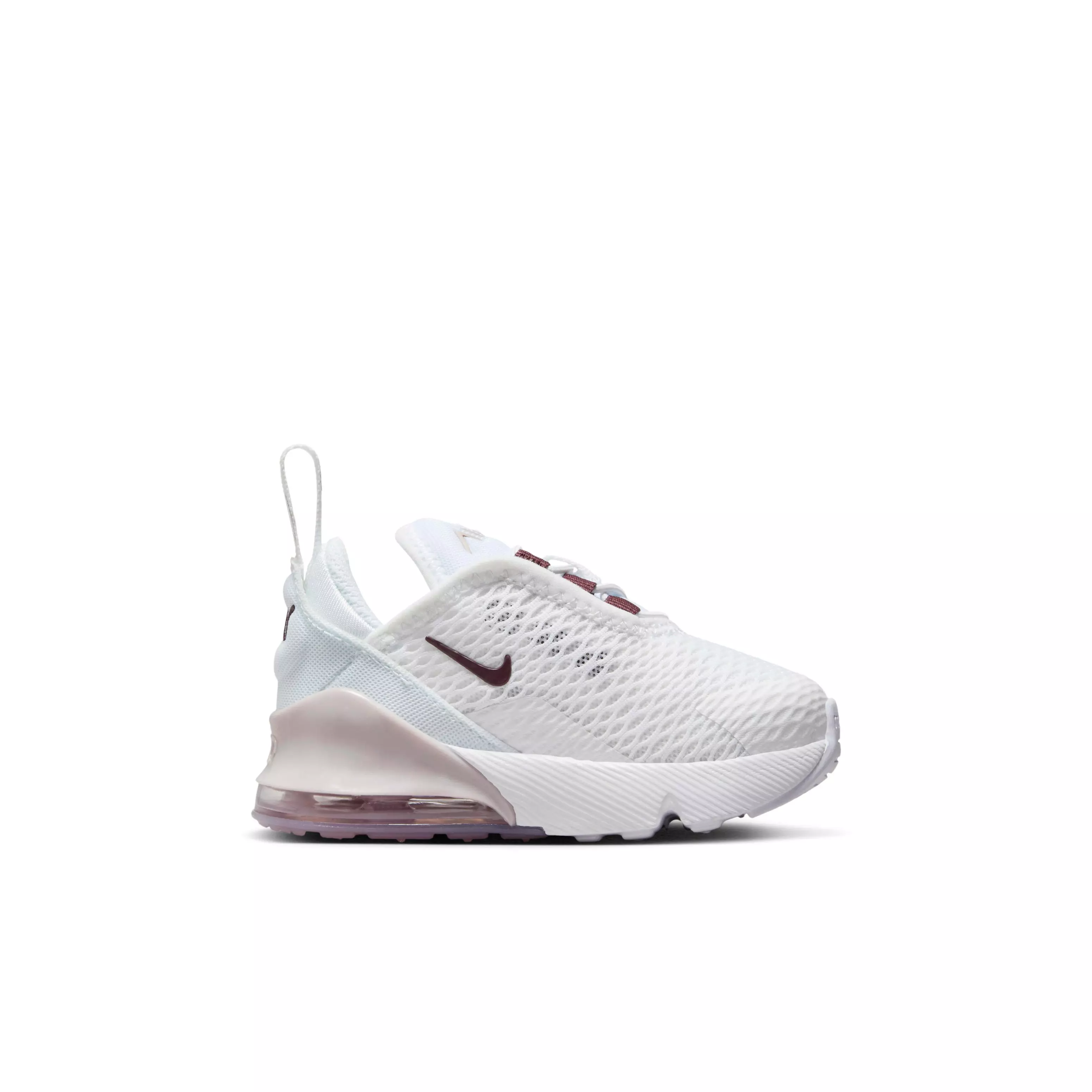 The Nike Air Max 270 "White/Platinum Violet/Burgundy Crush" Infant Girls' Shoe is all about BIG Air for little feet. Kiddos can see 270 degrees of Air cushioning from the sides to the back. Plus, these everyday kicks are comfy for all of their daily adventures.Features