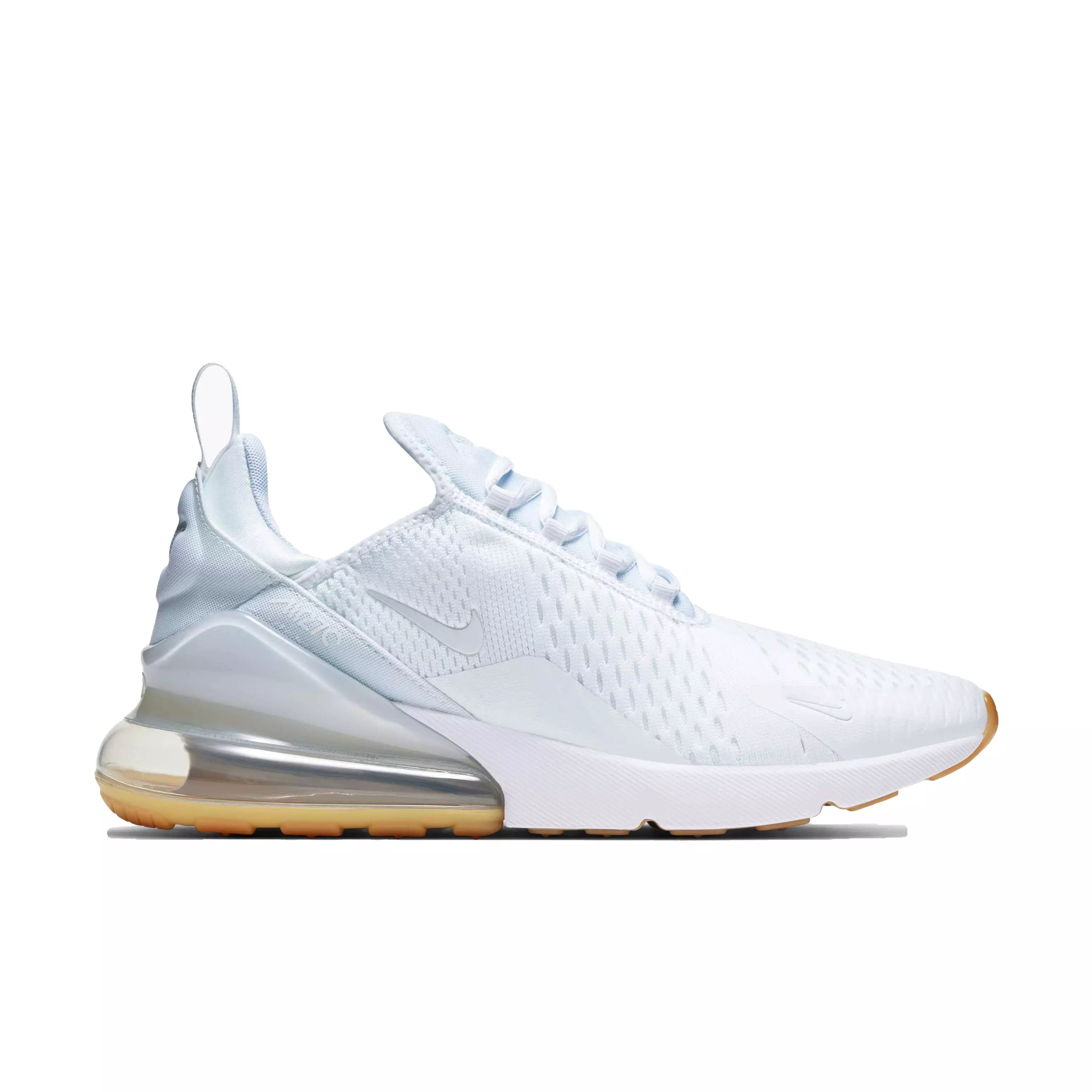 The Nike Air Max 270 "White/White/Gum Light Brown" Men's Shoe keeps it clean and simple. A fresh white upper is highlighted with a light brown rubber outsole for a subtle yet suave touch on this iconic design.