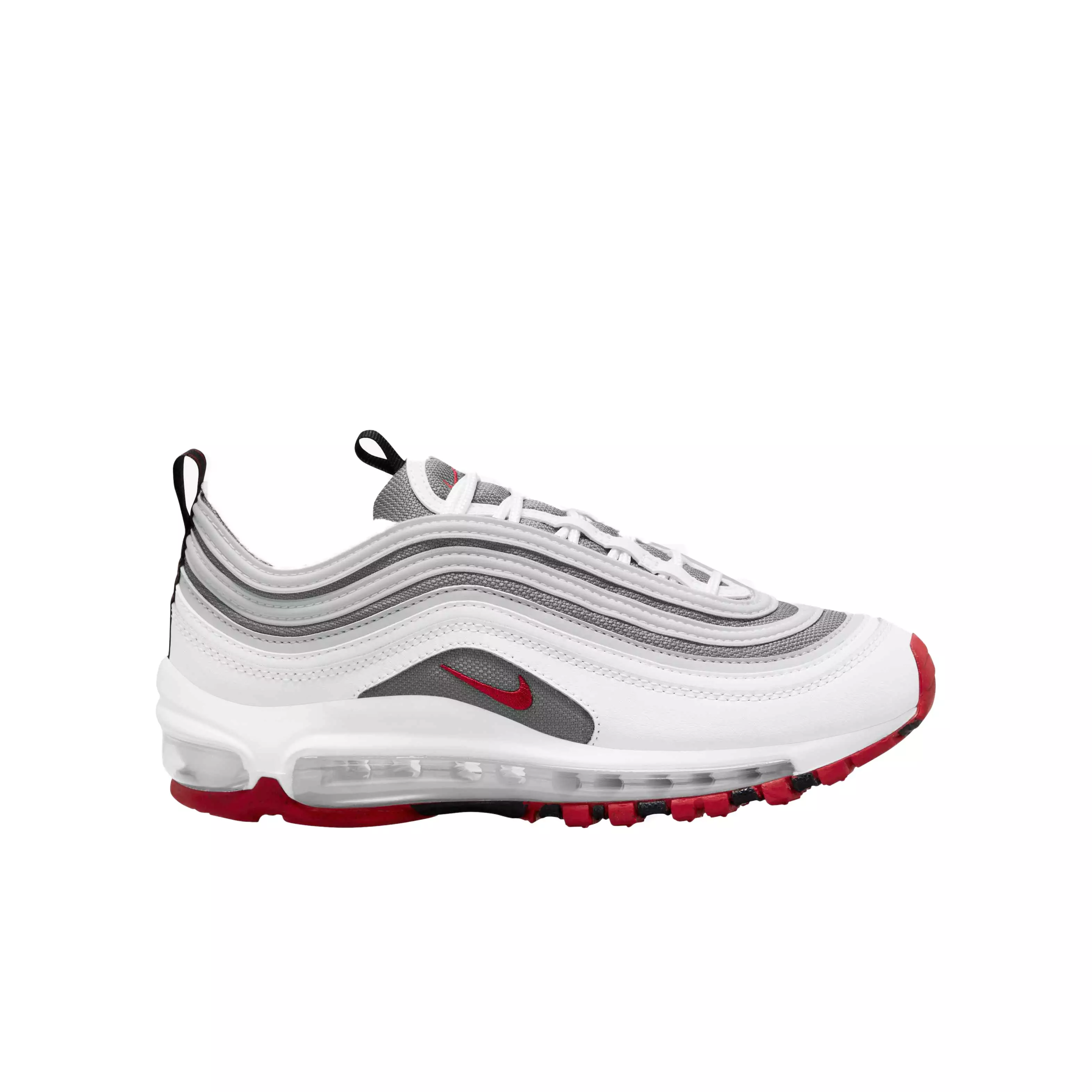 The Nike Air Max 97 Proto "White/Varsity Red/Particle Grey" Grade School Boys' Shoe is the shoe that will have you walking on Air—literally! This icon was the first to showcase Max Air underfoot from heel to toe. Plus, it rocks the wavy, water ripple-inspired lines that make the 97 a classic forever.