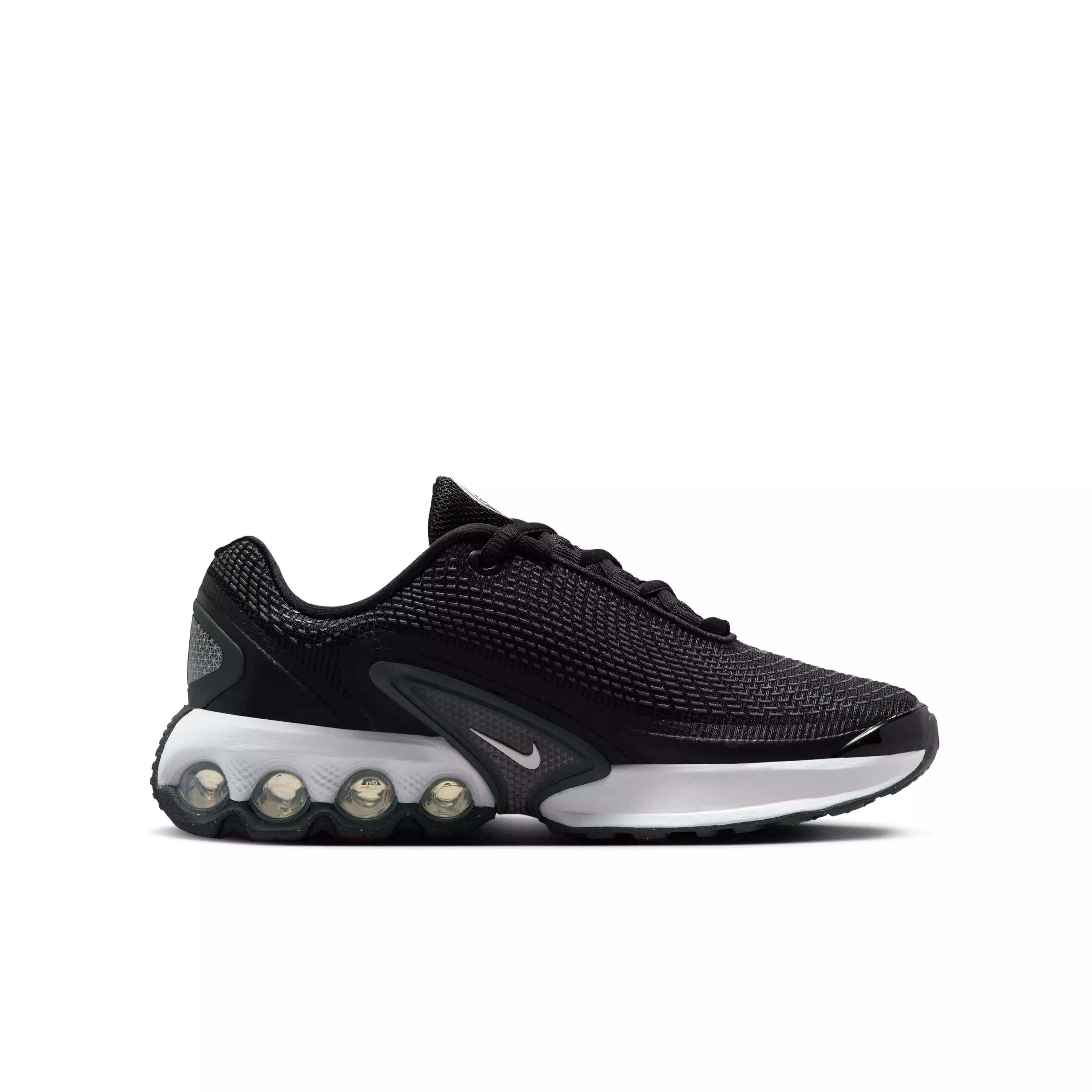 The Nike Air Max Dn "Black/Dark Grey/Black/White" Grade School Boys' Shoe features a Dynamic Air unit system with dual-pressure tubes that deliver a responsive, bouncy sensation on each step. Its streamlined profile reflects a futuristic design without added bulk.
