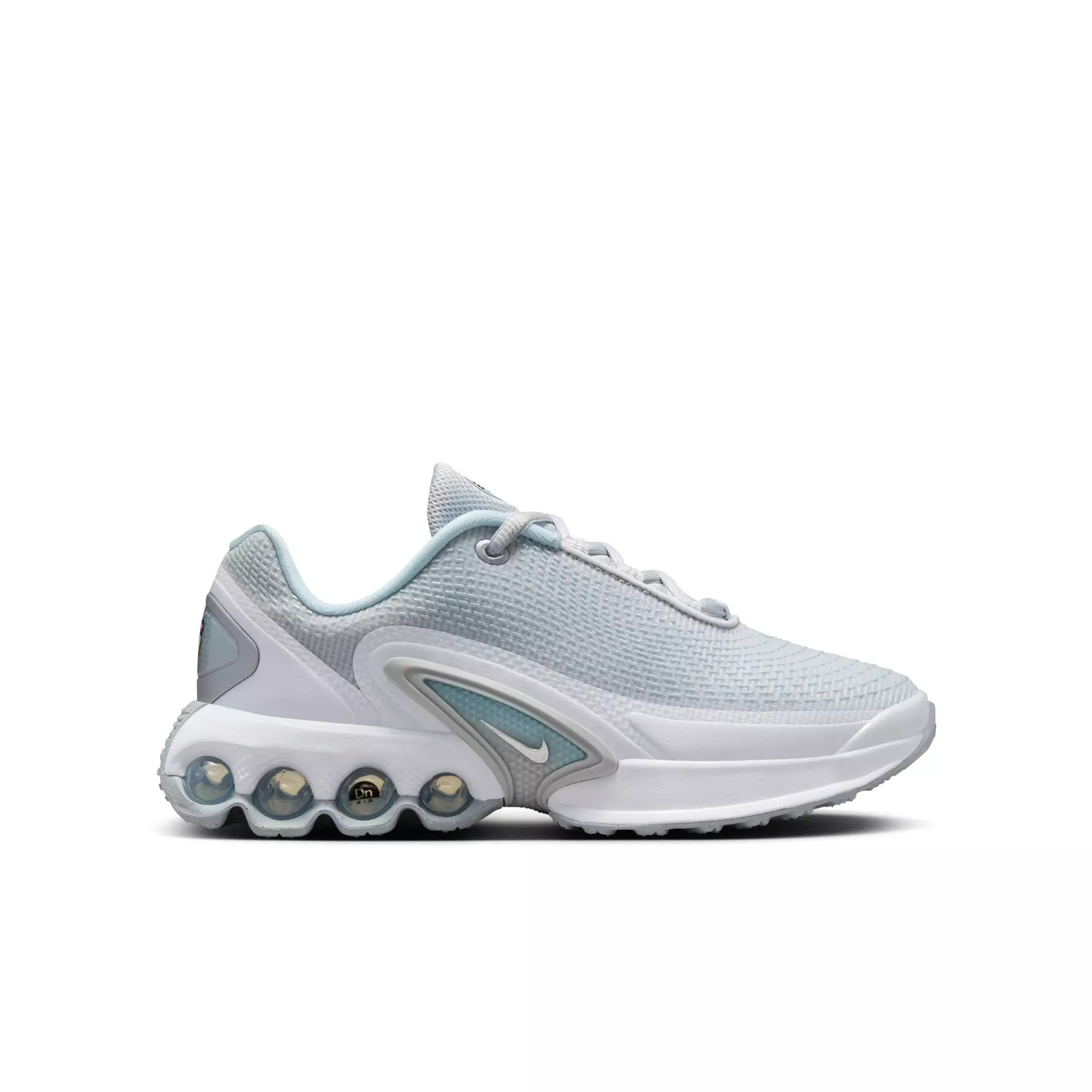 The Nike Air Max Dn "Pure Platinum/Metallic Silver" Grade School Kids' Shoe features a Dynamic Air unit system with dual-pressure tubes that deliver a lively bounce on every step. The system offers smooth support and responsive energy return.