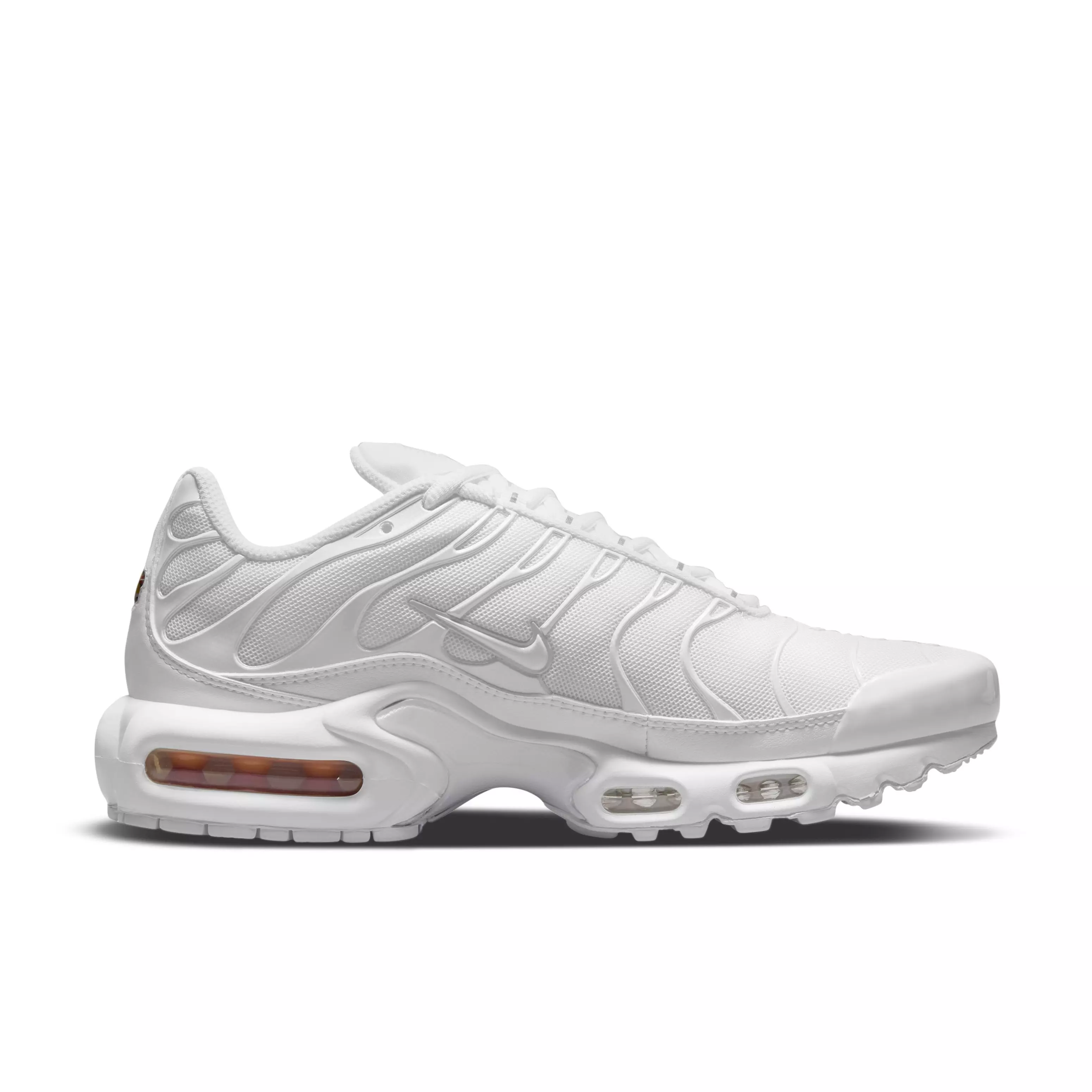 The Nike Air Max Plus "White/Pure Platinum/White" Women's Shoe delivers a tuned Air experience with premium stability and unbelievable cushioning. Its airy mesh upper pairs original wavy design lines with polished TPU accents on the toe and sides.