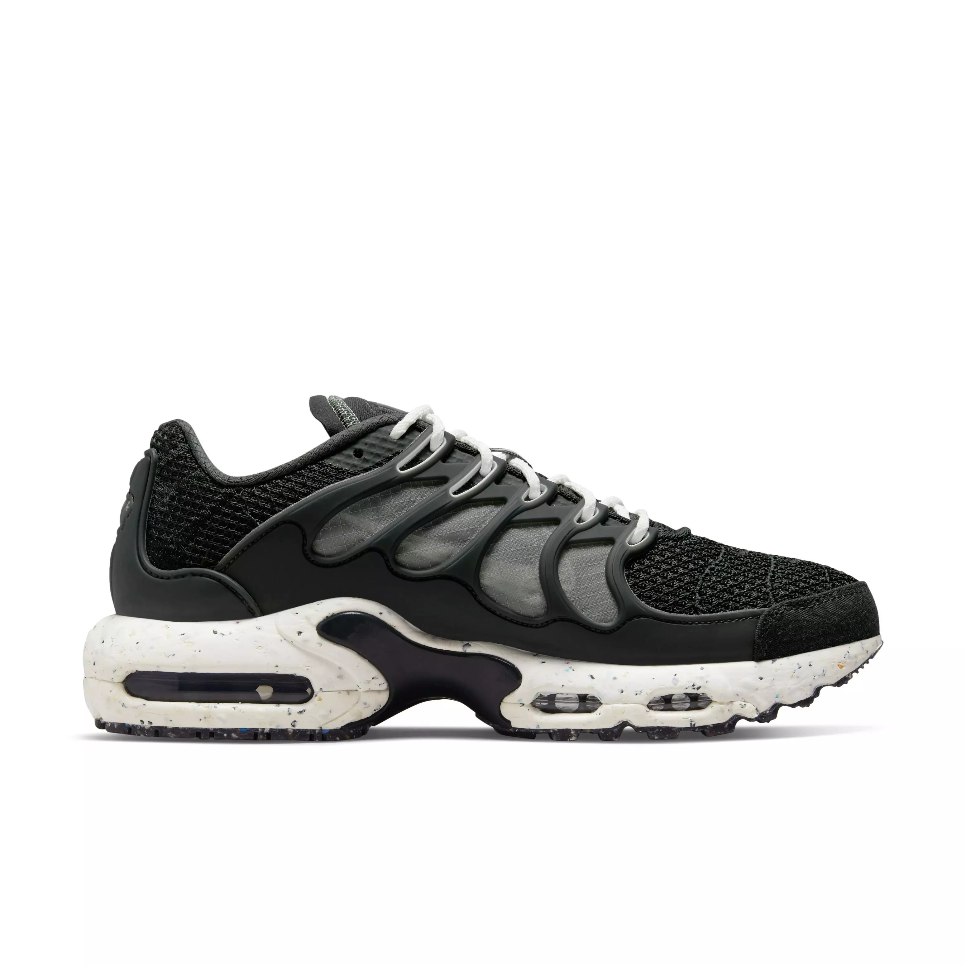 Let your attitude have the edge in the Nike Air Max Terrascape Plus "Off Noir/Black/Anthracite/Summit White" Men's Shoe, the rebellious icon recrafted for the future. Offering a tuned Air experience that delivers premium stability and unbelievable cushioning, rolled into a futuristic design crafted with at least 20% recycled materials by weight. The speckles in the rubber outsole are made from Nike Grind, which is recycled waste (i.e., the scraps) from the footwear manufacturing process.
