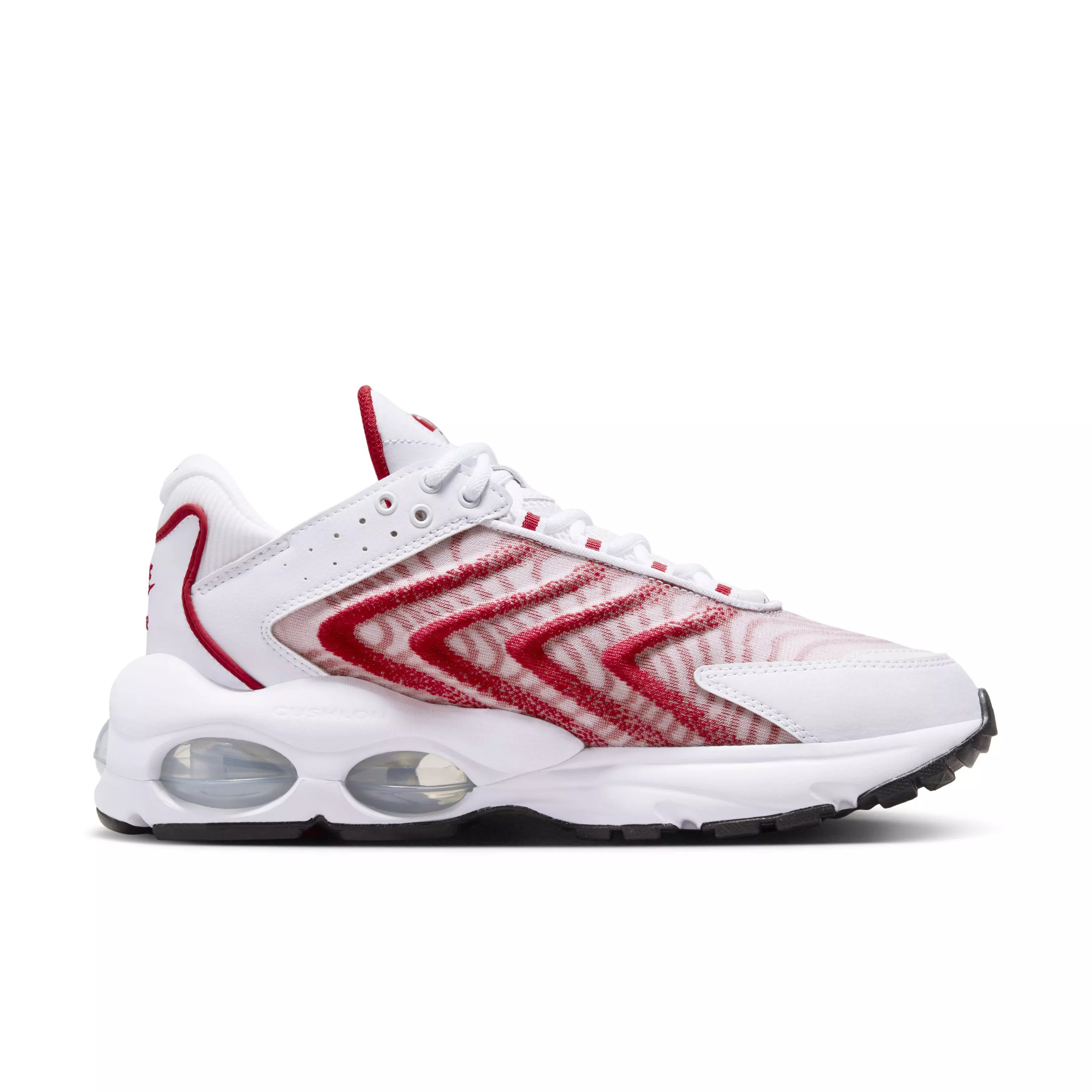 So you're in love with the classic look of the '90s, but you got a thing for today's fast-paced culture. Meet the Nike Air Max TW "White/University Red/White/Black" Men's Shoe. Inspired by the treasured franchise that brought Nike Air cushioning to the world and laid the foundation for the track-to-street aesthetic, its eye-catching design delivers a 1-2 punch of comfort and fashion. Ready to highlight any ‘fit, its lightweight upper pairs angular and organic lines to create an entrancing haptic effect. The contrasting colorways make it easy to style. And if you’re ready for the next step, the 5 windows underfoot deliver a modern edge to visible Air cushioning.Features