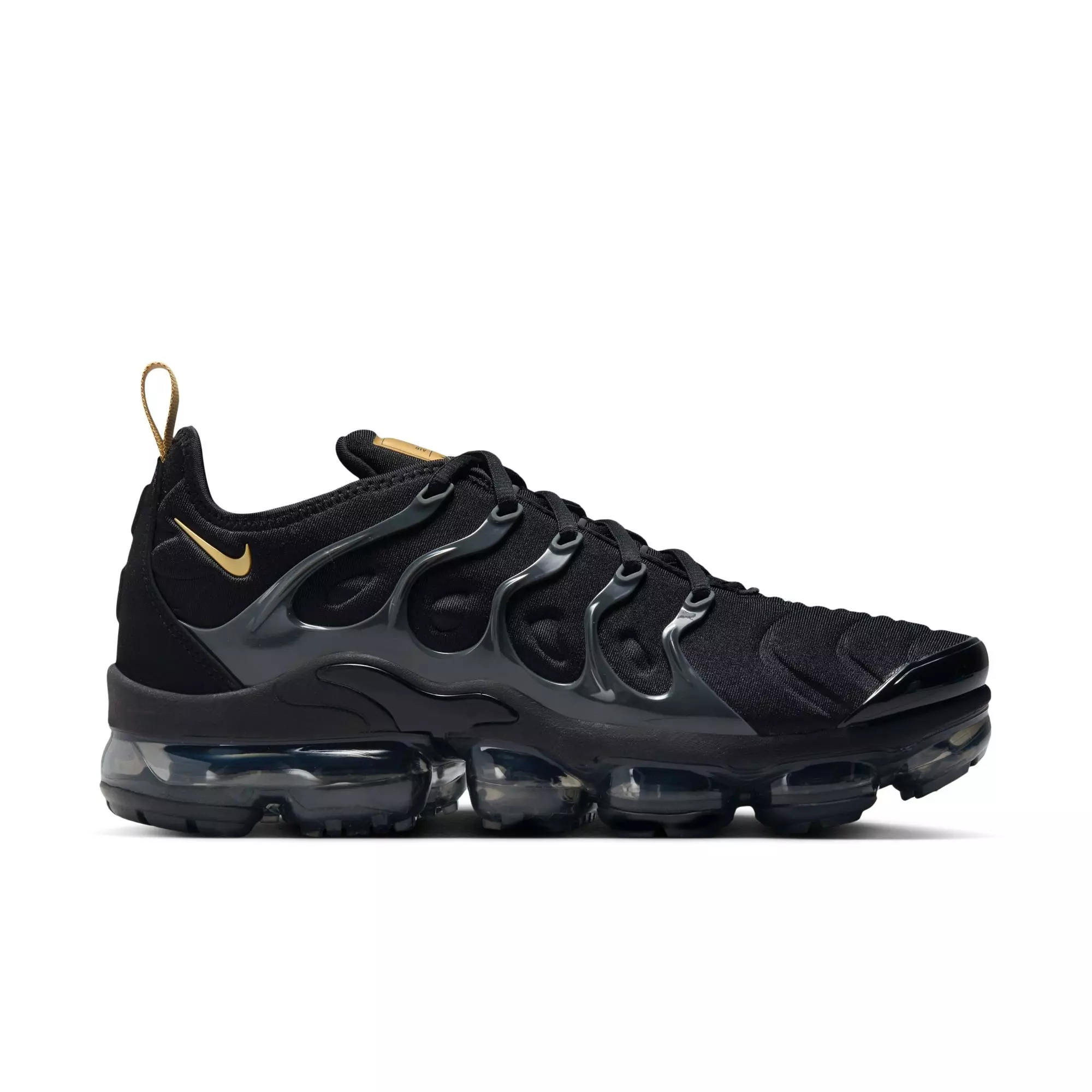 The Nike Air VaporMax Plus "Black/Metallic Gold" Men's Shoe looks to the past and propels you into the future. Nodding to the 1998 Air Max Plus with its floating cage, padded upper and heel logo, it adds revolutionary VaporMax Air technology underfoot to ramp up the comfort and to create a modern look.Features