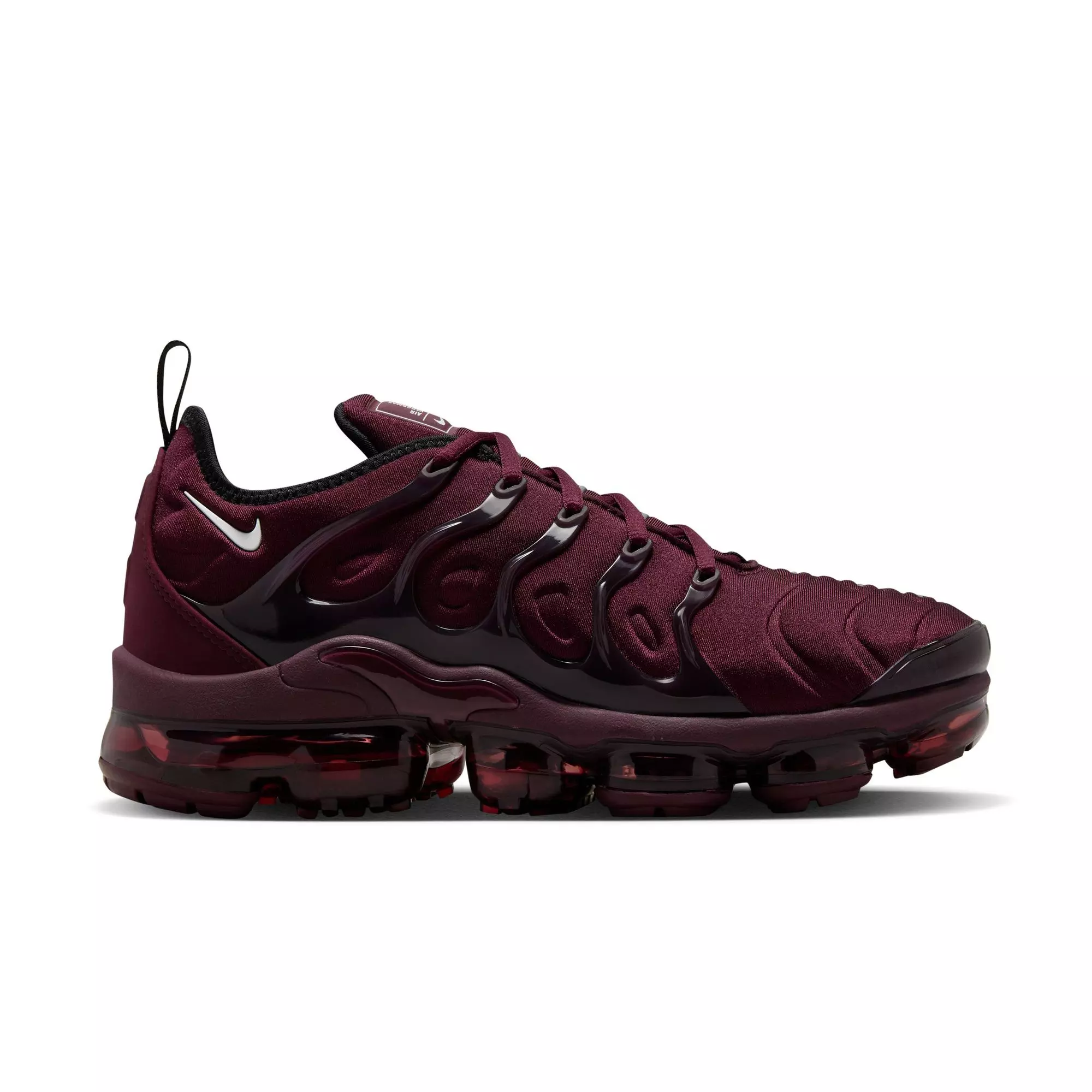 The Nike Air VaporMax Plus "Night Maroon/White/Black/Cedar" Men's Shoe looks to the past to propel you into the future. Nodding to the Air Max Plus released in '98 with its floating cage, padded upper and heel logo, it adds revolutionary VaporMax Air technology to ramp up the comfort and create a modern look.Features