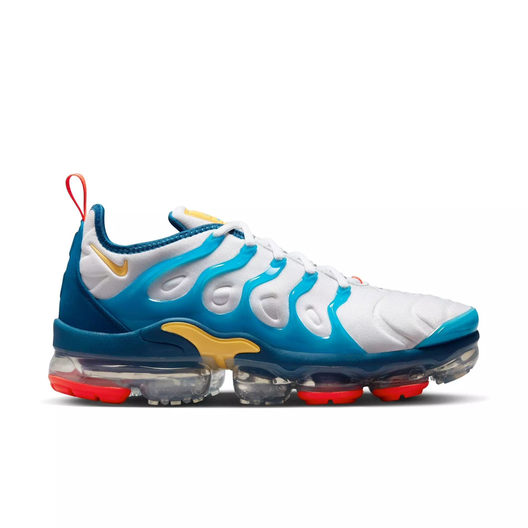 The Nike Air VaporMax Plus "White/Citron Pulse/Industrial Blue" Men's Shoe looks to the past to propel you into the future. Nodding to the '98 Air Max Plus with its floating cage, padded upper and heel logo, it adds revolutionary VaporMax Air technology to ramp up the comfort and create a modern look.