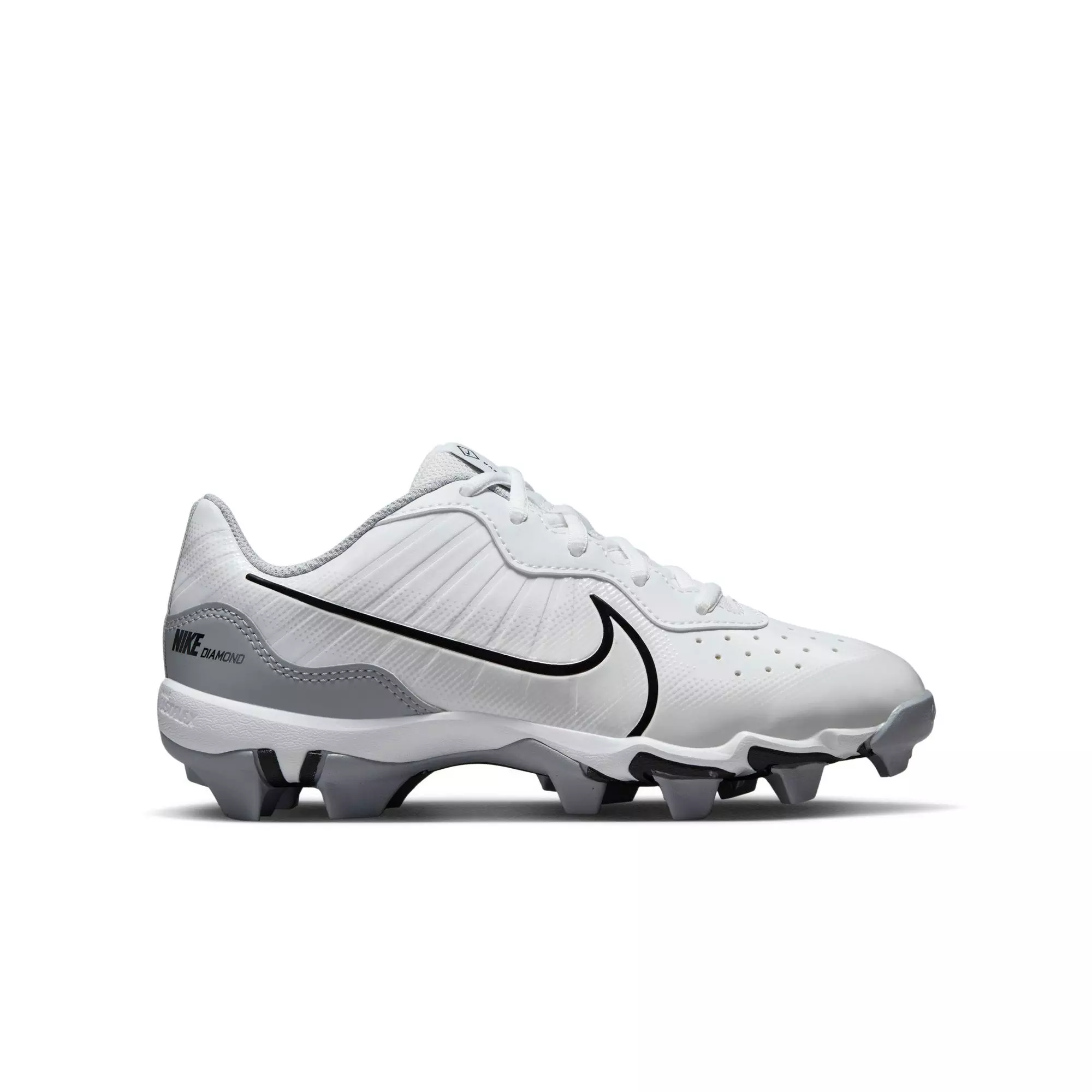 These game-changers, the Nike Alpha Huarache 4 Keystone "White/Black/Wolf Grey/Pure Platinum" Grade School Boys' Baseball Cleat​​ aren’t your grandaddy’s old-school metal spikes. With a design that’s more street sneaker than clunky cleat, you can swing, slide, sprint and strut in true style and comfort. Let the baseball world know what kind of bat-wielding beast you are in a ride that’s plushy smooth, but not at the expense of looking too tame when you break into your home run trot around the bags.