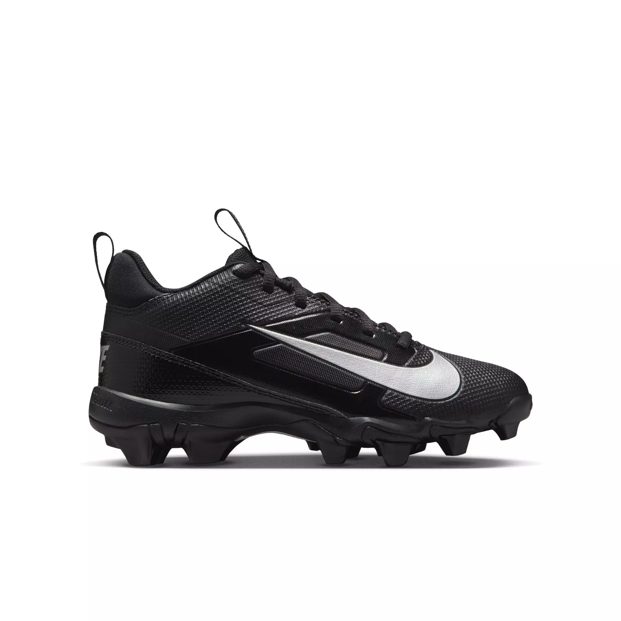 The Nike Alpha Menace 4 Shark "Black/Metallic Silver" Grade School Boys' Football Cleat combines breathable mesh with synthetic leather for lightweight support and lasting comfort. Nike Fastflex technology promotes natural foot flexion, enhancing agility and traction for quick, confident moves on the field.Designed for performance, these cleats provide the stability and grip needed for game-saving plays and explosive sprints. The Black/Metallic Silver colorway delivers a sleek, modern look that stands out in any lineup.