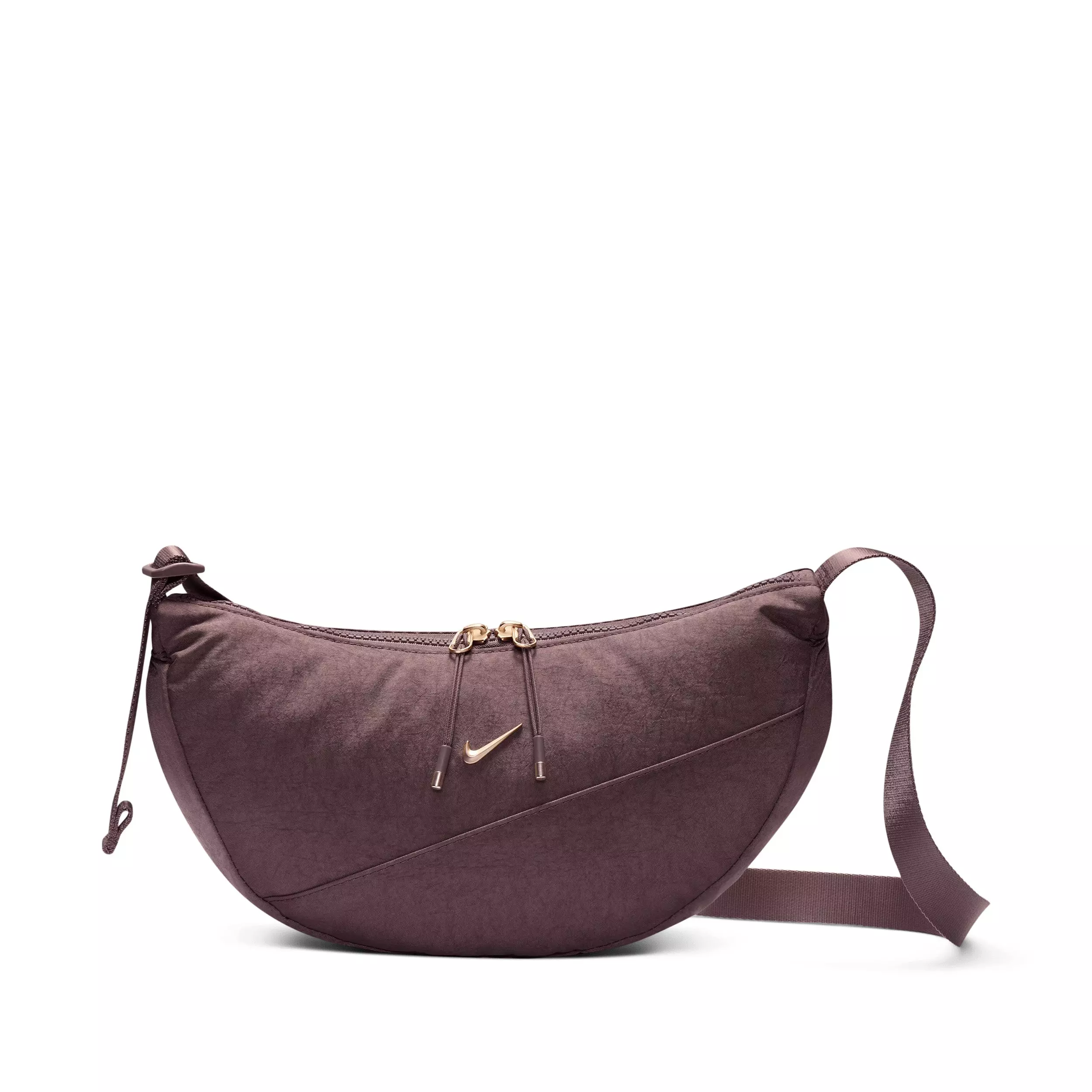 Keep your essentials close and your style game on point with the Nike Aura Crescent Crossbody Bag - Tattoo/Tattoo/Light Transparent Gold. The main pocket provides quick access to small items while interior slip pockets make organization easy.Features