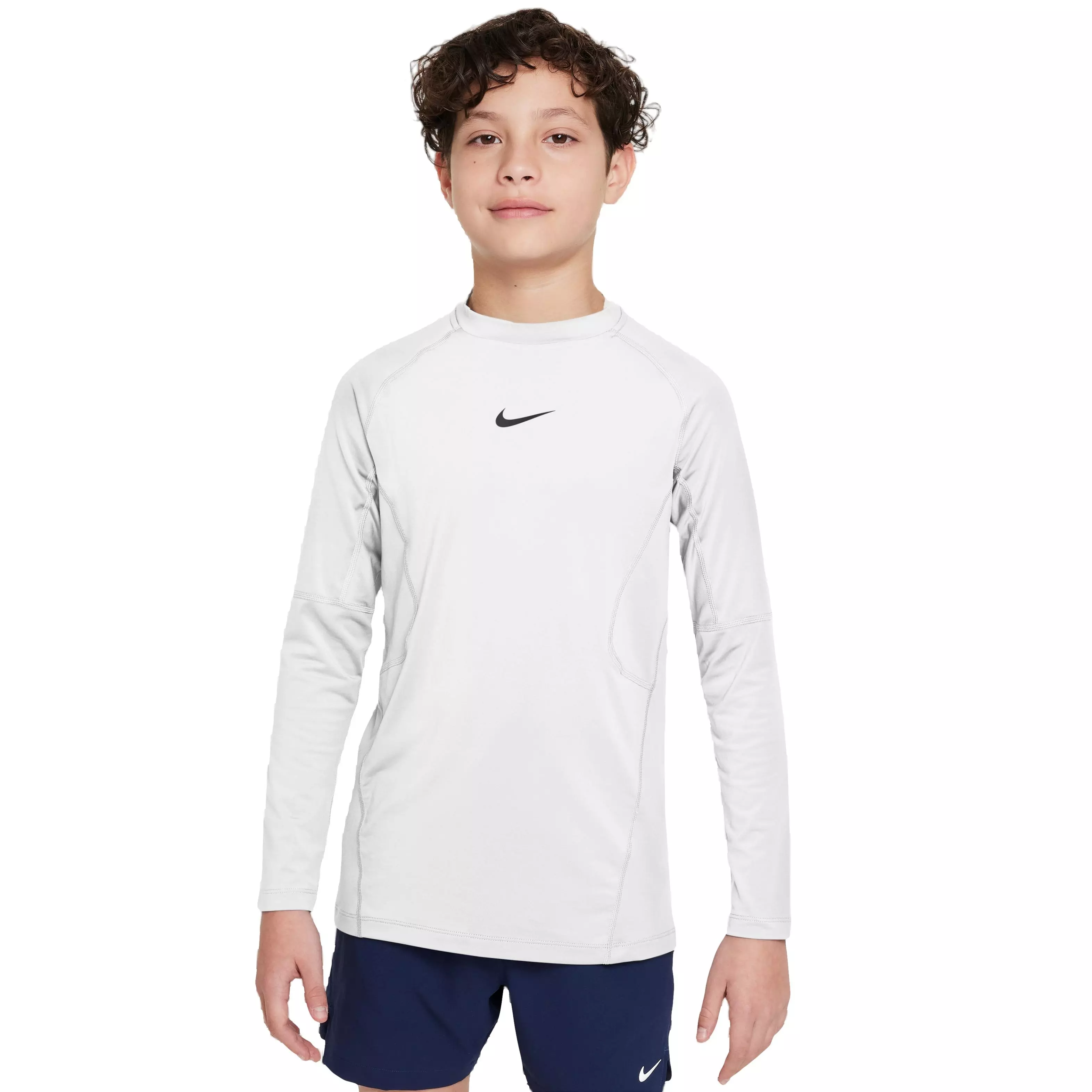The Nike Big Boys' Compression Longsleeve Tee - White uses lightweight fabric with built-in ventilation zones to help you stay cool and dry during warmups through cool downs. Its compression fit hugs the body and supports every move.
