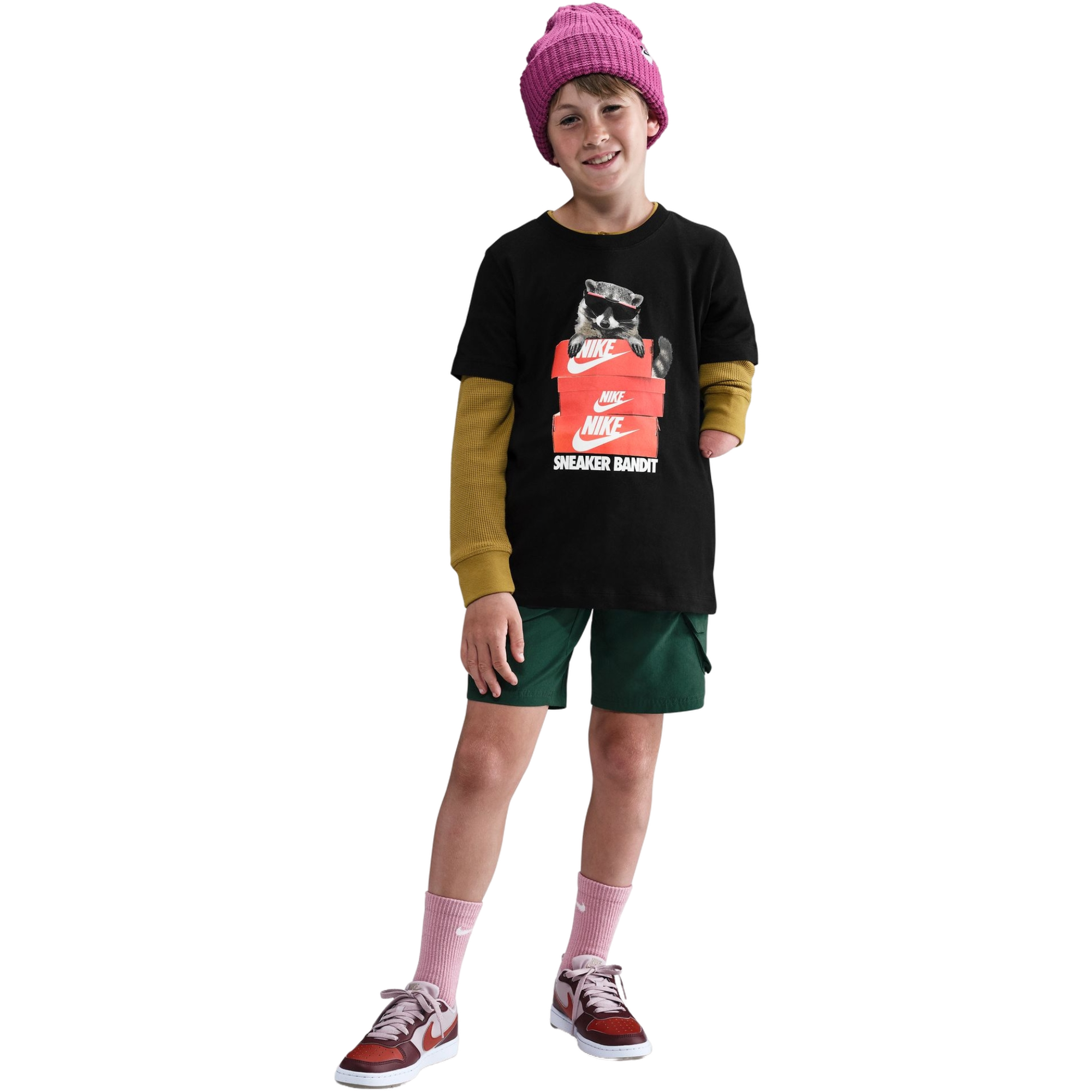 Keep them comfy in the Nike Big Boys' Racoon Tee - Black, a soft cotton jersey top made for everyday moves. The classic crewneck and standard fit deliver an easy, relaxed feel that layers well year-round.Durable, breathable fabric stands up to school days and play, while the bold Nike Swoosh adds sport-ready style. Pair it with shorts or joggers for a go-to look that feels good from first bell to weekend hangouts.