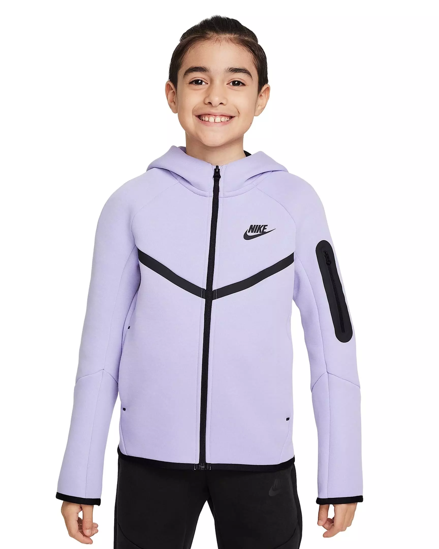 The Nike Big Boys' Sportswear Tech Fleece Full-Zip Hooded Jacket features premium lightweight fleece that feels smooth inside and out. Its streamlined fit allows layering without bulk and enhances freedom of movement.