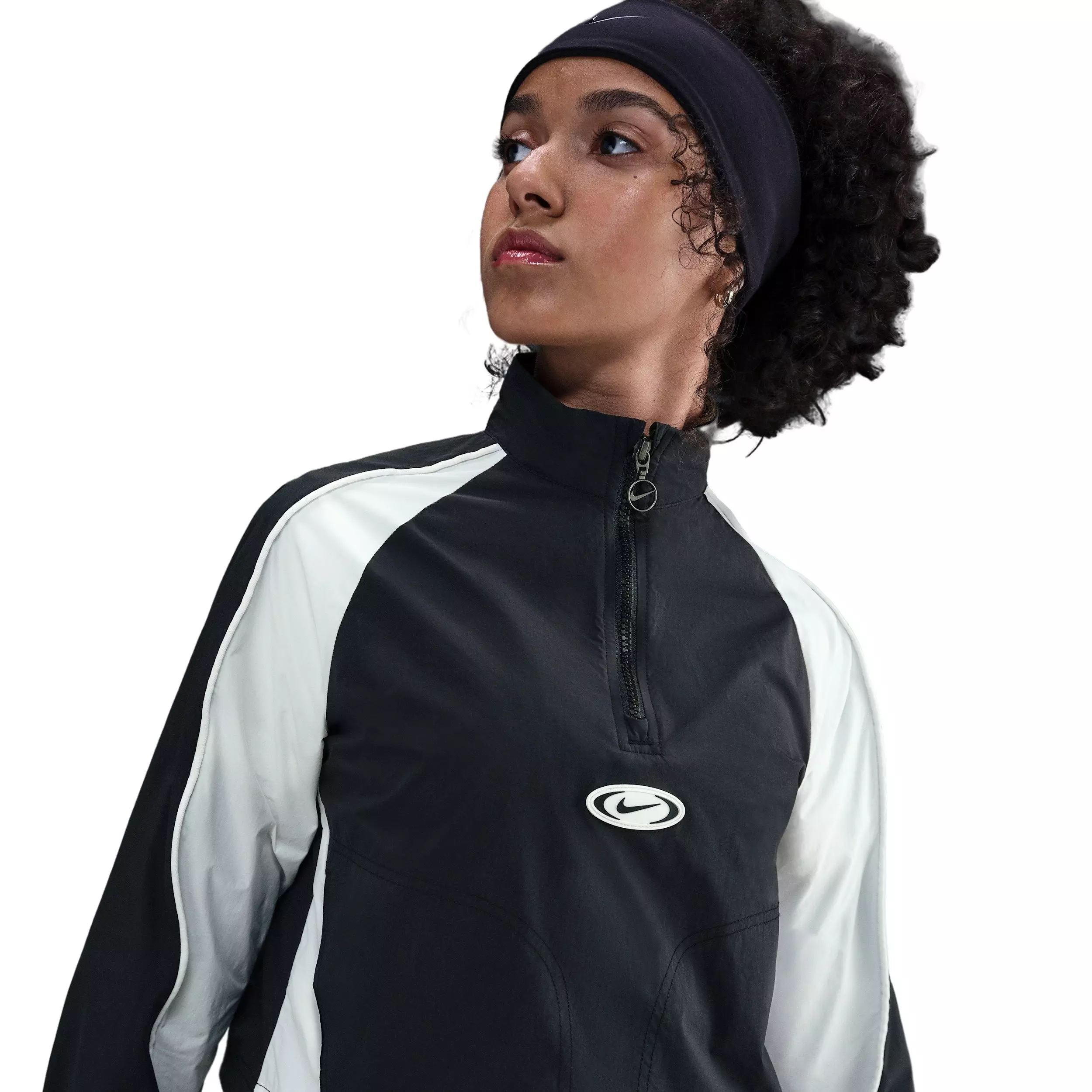 The Nike Big Girls' Sportswear 1/4 Zip Track Jacket - Black brings retro sport style with everyday comfort. Smooth, water-repellent nylon feels lightweight yet durable, while the quarter-zip lets her adjust coverage on the go for changing weather and activity.