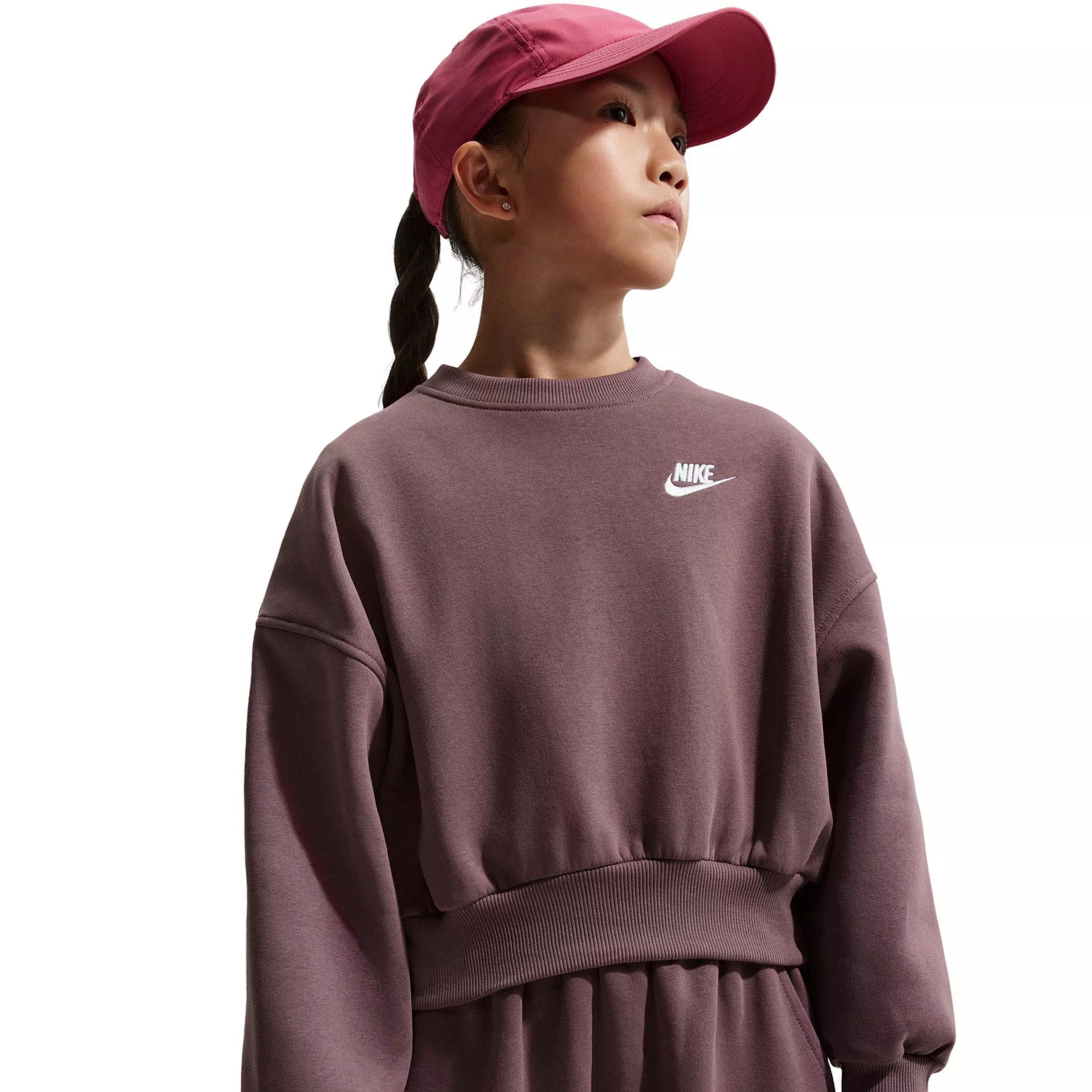 Always cool. Always comfortable. Smooth on the outside and brushed soft on the inside, this lightweight tattoo purple Nike Big Girls' Sportswear Club Fleece Boxy Crew-Neck Sweatshirt is an easy layer when you want a little extra warmth. Baggy through the body with a slight crop, it offers room to move without feeling too big.Features