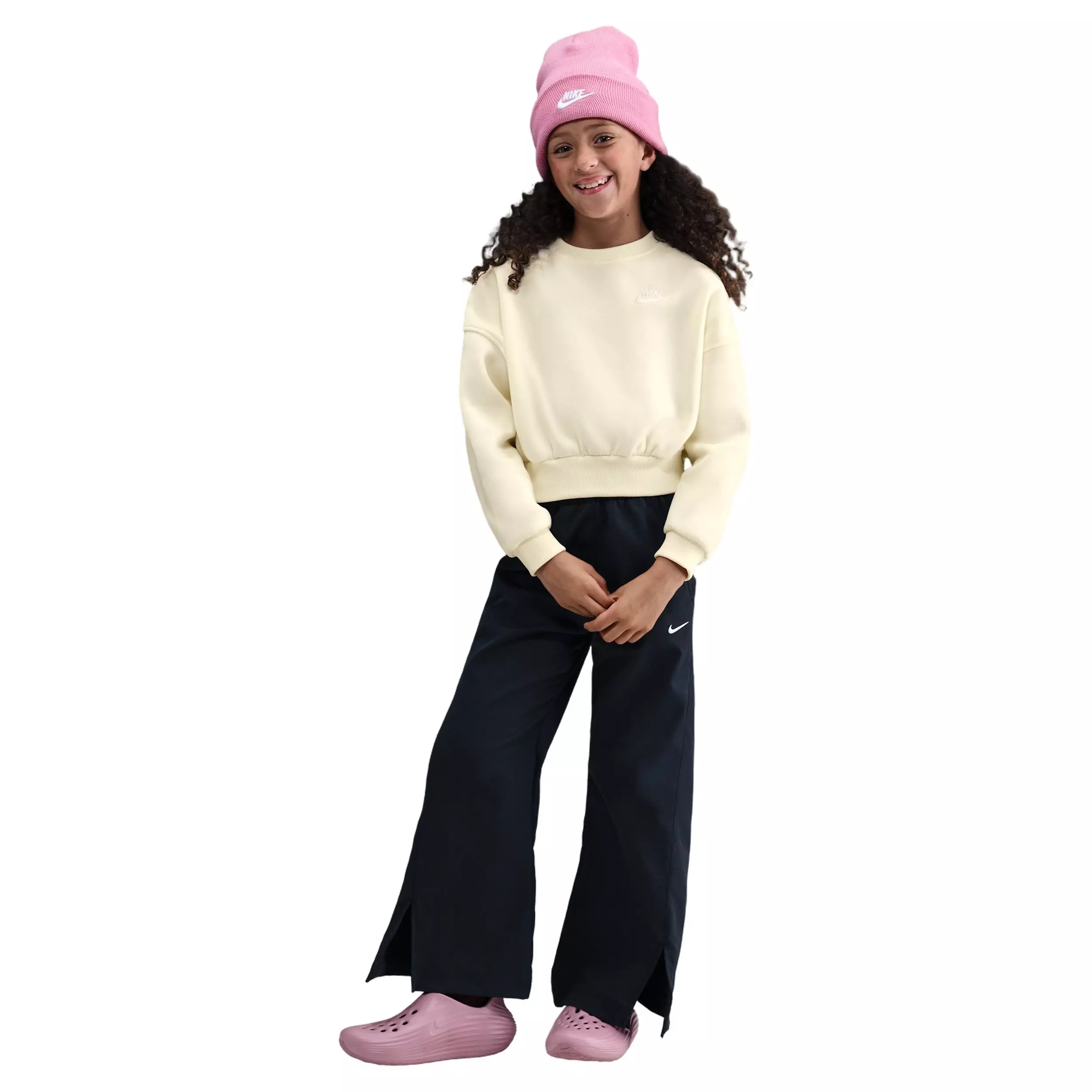 The Nike Big Girls’ Sportswear Club Fleece Boxy Crewneck Sweatshirt - Brown adds easy warmth for school days and weekends. Smooth on the outside and brushed soft inside, this lightweight layer has a boxy, slightly cropped fit that gives room to move without feeling bulky.