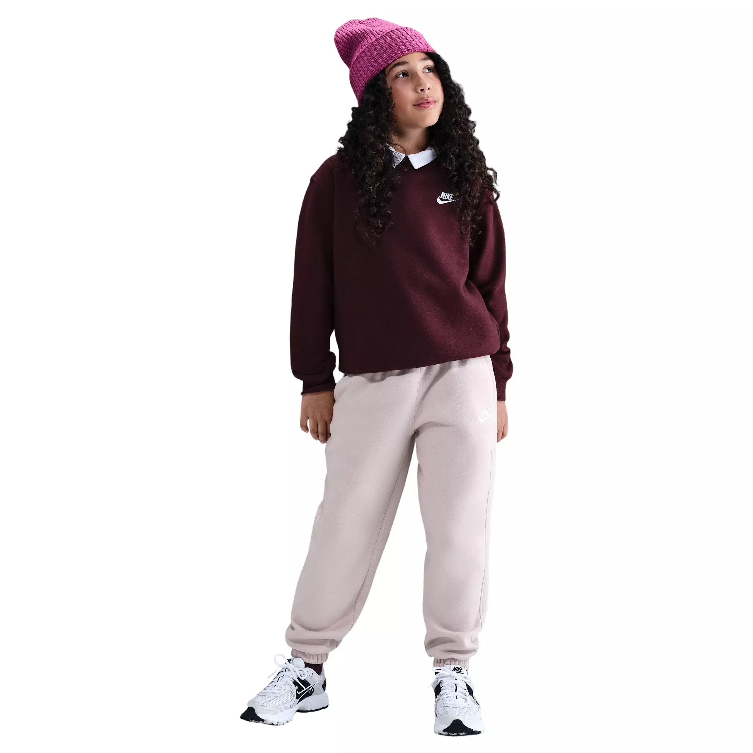 The Nike Big Girls’ Sportswear Club Fleece Loose Sweatpants - Light Purple are an effortless layer for school, practice, or lounging. Soft, durable fabric helps keep her comfortable through the day, and the roomy fit lets her move freely and layer with tees or hoodies as temps change.