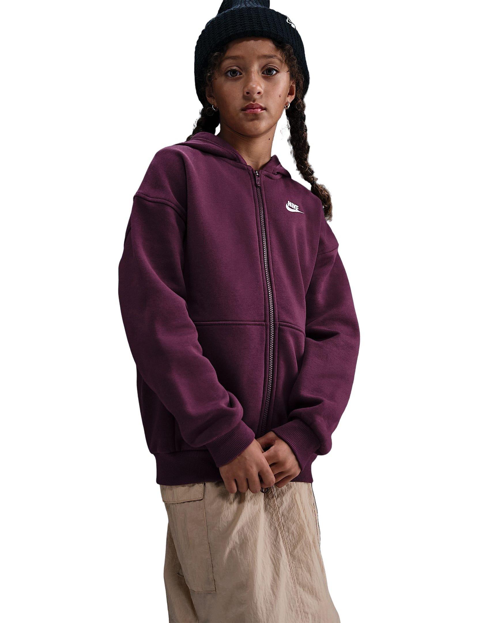Everyone loves a soft, roomy hoodie. This Nike Big Girls' Sportswear Club Fleece Oversized Full-Zip Hooded Jacket - Red has plenty of space through the arms and body, giving you a comfy and relaxed feel. A classic for a reason, the embroidered Futura logo on the chest adds signature Nike style.Features