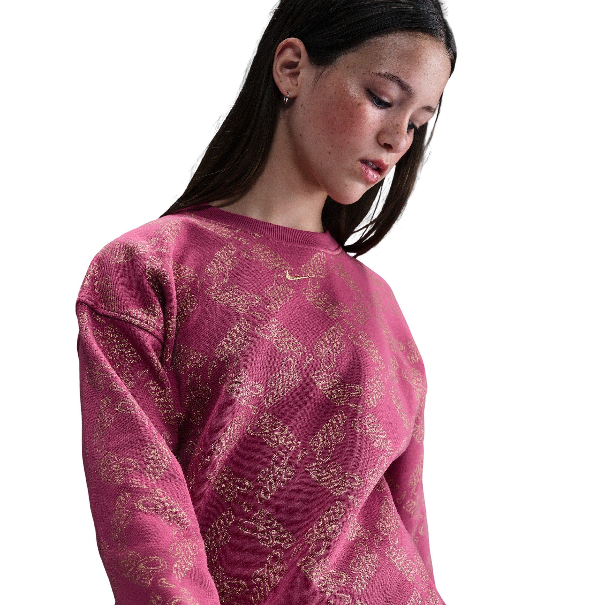 Roomy, lightweight and luxurious, this beet purple & gold Nike Big Girls' Sportswear Club Fleece Oversized Printed Crewneck Sweatshirt is as warm as it is bright—glistening with gold print, it helps make every room you enter a little brighter.Features