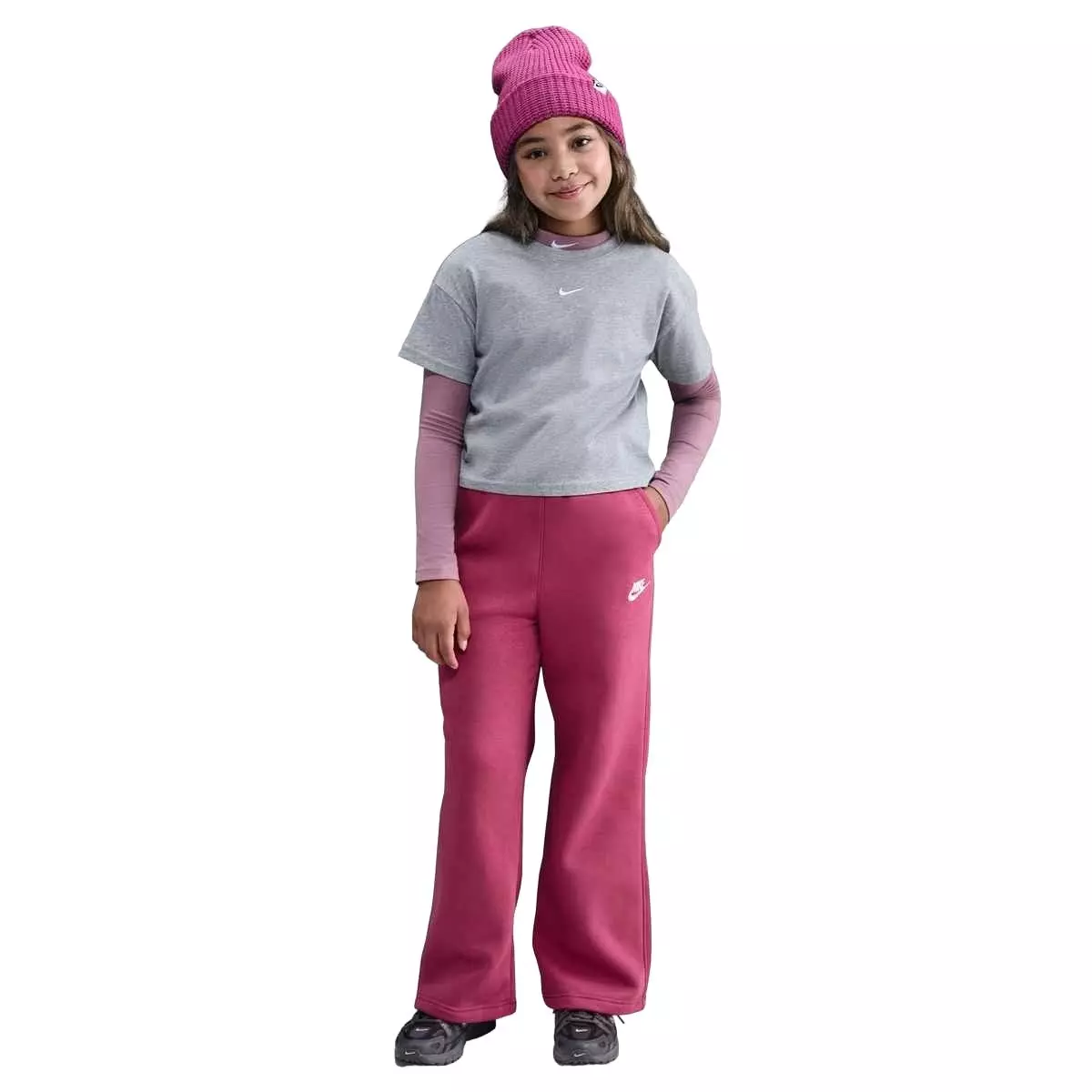 Always cool. Always comfortable. Our Nike Club Fleece favorites are closet staples you can wear again and again. Smooth on the outside and brushed soft on the inside, these lightweight Nike Big Girls' Sportswear Club Fleece Wide-Leg Pants - Purple are an easy way to make chilly days feel a little cozier.Features