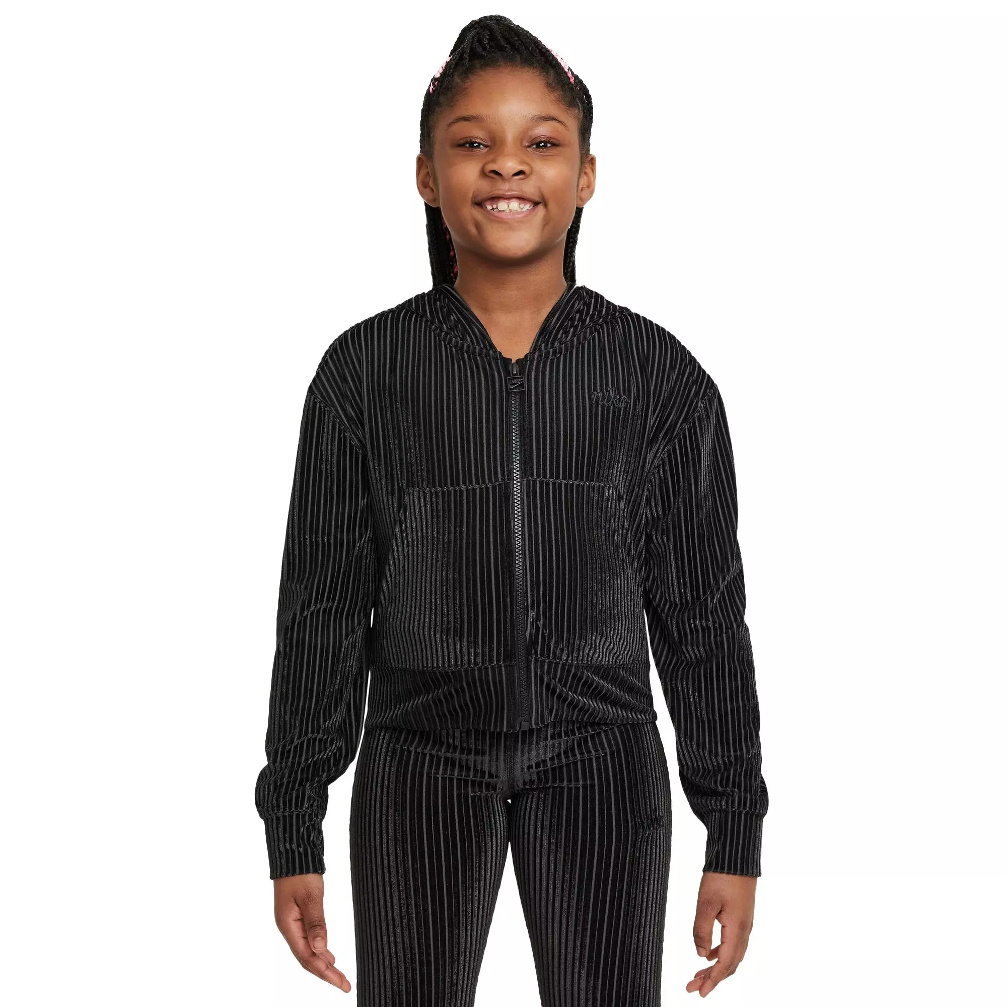 Luxuriously soft with a subtle shine, the Nike Big Girls’ Sportswear Full‑Zip Jacket delivers a plush, cozy feel that’s perfect for chilly days. The smooth knit fabric has gentle stretch for easy movement, while the full‑length zipper makes layering simple from school to weekends.