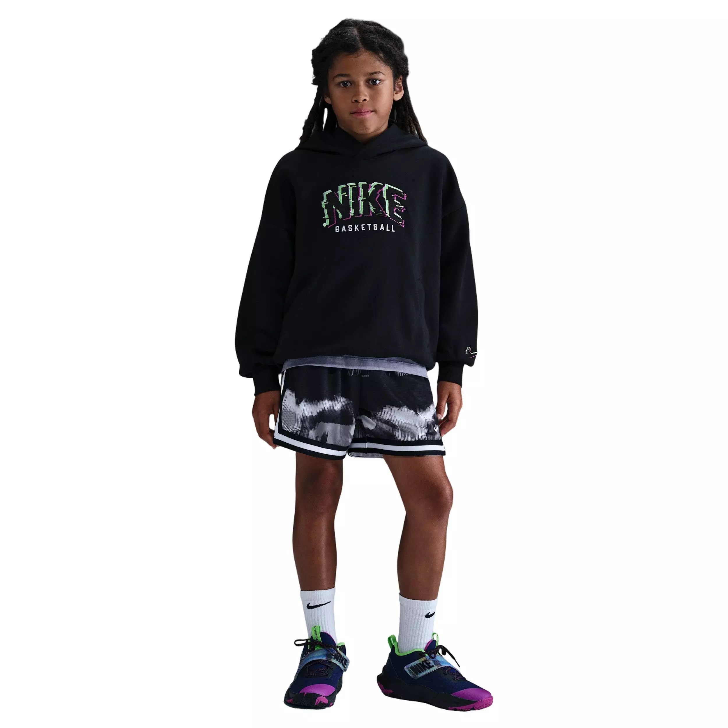 No need to adjust your screens—this is the glitch series. Take your game from the courts to your living room to the global digital stage, all in ultimate comfort in these black Nike Big Kids' DNA Dri-FIT 5" Basketball Shorts. Dri-FIT tech wicks sweat to help keep you cool and dry, no matter the level or boss your battling.Features