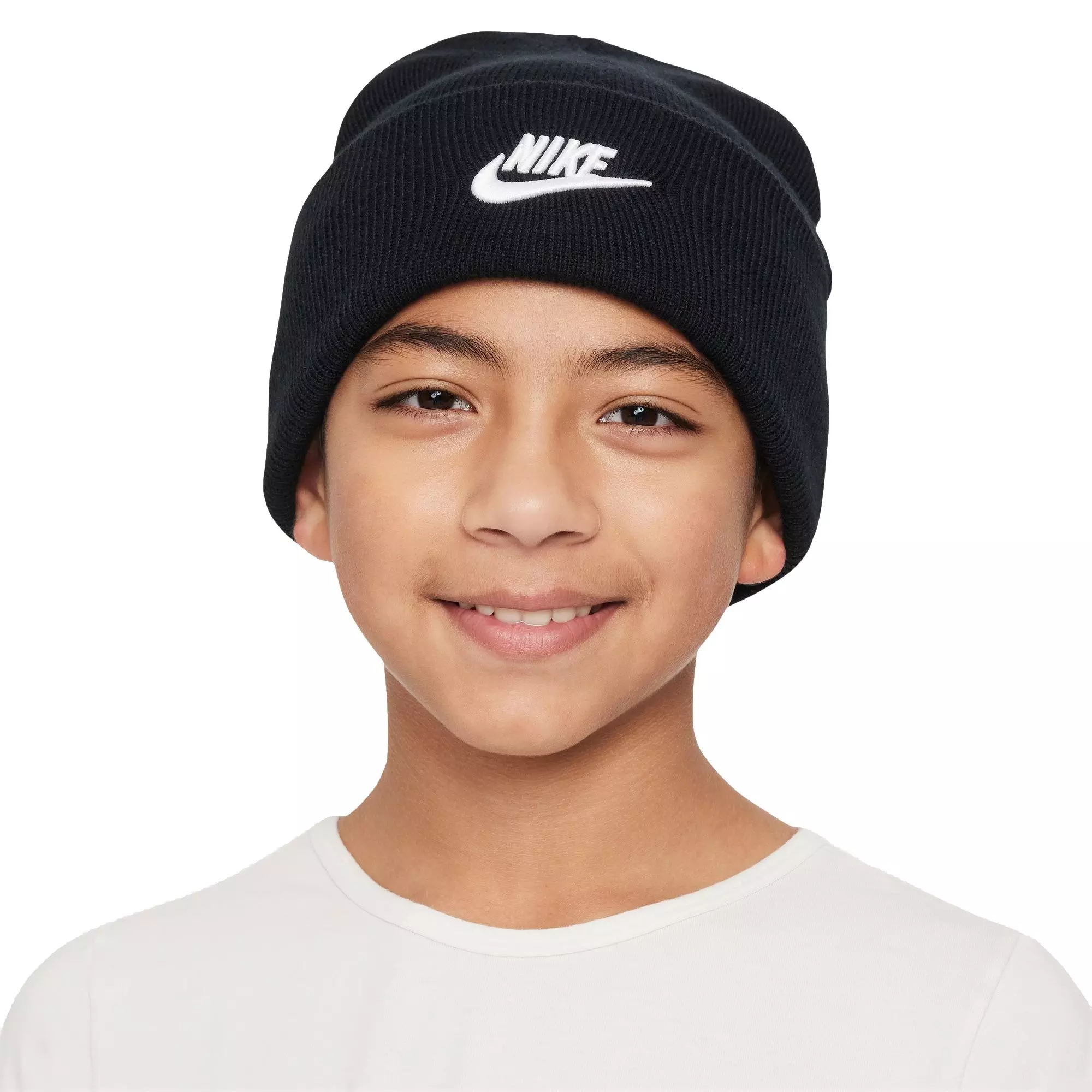 The Nike Big Kids' Peak Beanie features a plush knit cuff that seals in warmth and stays snug against biting wind. Its streamlined fit secures coverage over ears, delivering consistent comfort during winter weather.