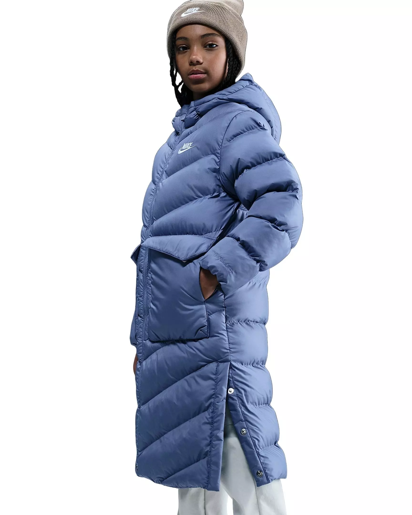 Dial up the warmth with this Nike Big Kids' Sportswear All Day Play Therma-FIT Loose-Fit Knee-Length Puffer Parka - Blue. It pairs lightweight synthetic insulation with our Therma-FIT technology to pack in the heat without weighing you down. A loose fit and snaps at the sides help you layer and move with ease.Features