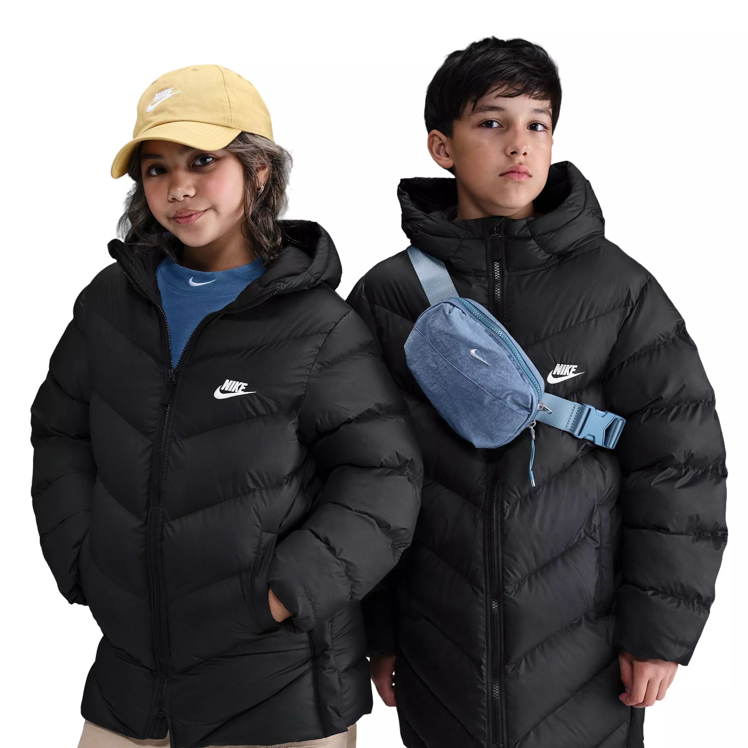Dial up the warmth without the weight in the Nike Big Kids' Sportswear All Day Play Therma-FIT Loose-Fit Mid-Length Puffer Jacket - Black. Lightweight synthetic insulation works with Therma-FIT technology to help hold in heat during cold-weather outings.