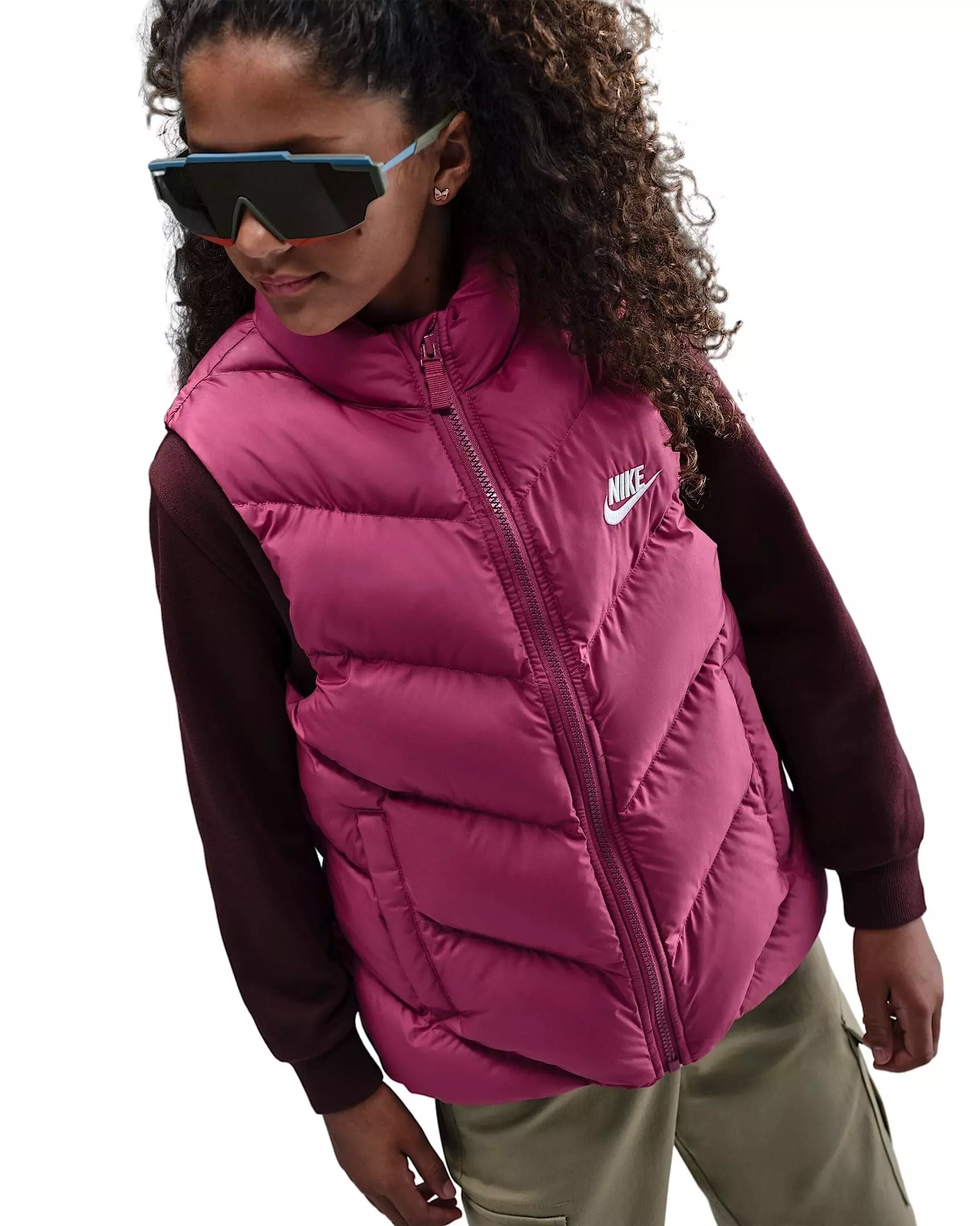 Keep kids warm without bulk in the Nike Big Kids' Sportswear All Day Play Therma-FIT Loose-Fit Puffer Vest - Purple. Lightweight synthetic insulation teams with Therma-FIT technology to retain heat, while the loose, roomy cut leaves space for hoodies and long sleeves.
