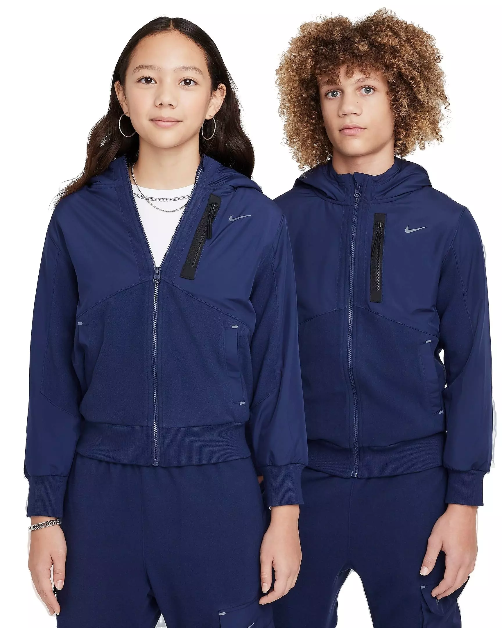Stay adventure ready with pieces that combine city style with modern utility in this Nike Big Kids' Sportswear City Utility EasyOn Therma-FIT Winterized Jacket. Smooth woven panels pair with soft brushed fleece and our Therma-FIT tech to help keep you warm when temps drop. Plus, our innovative pockets use a secret inner flap to trap your stuff inside, so you can adventure without worry.Features