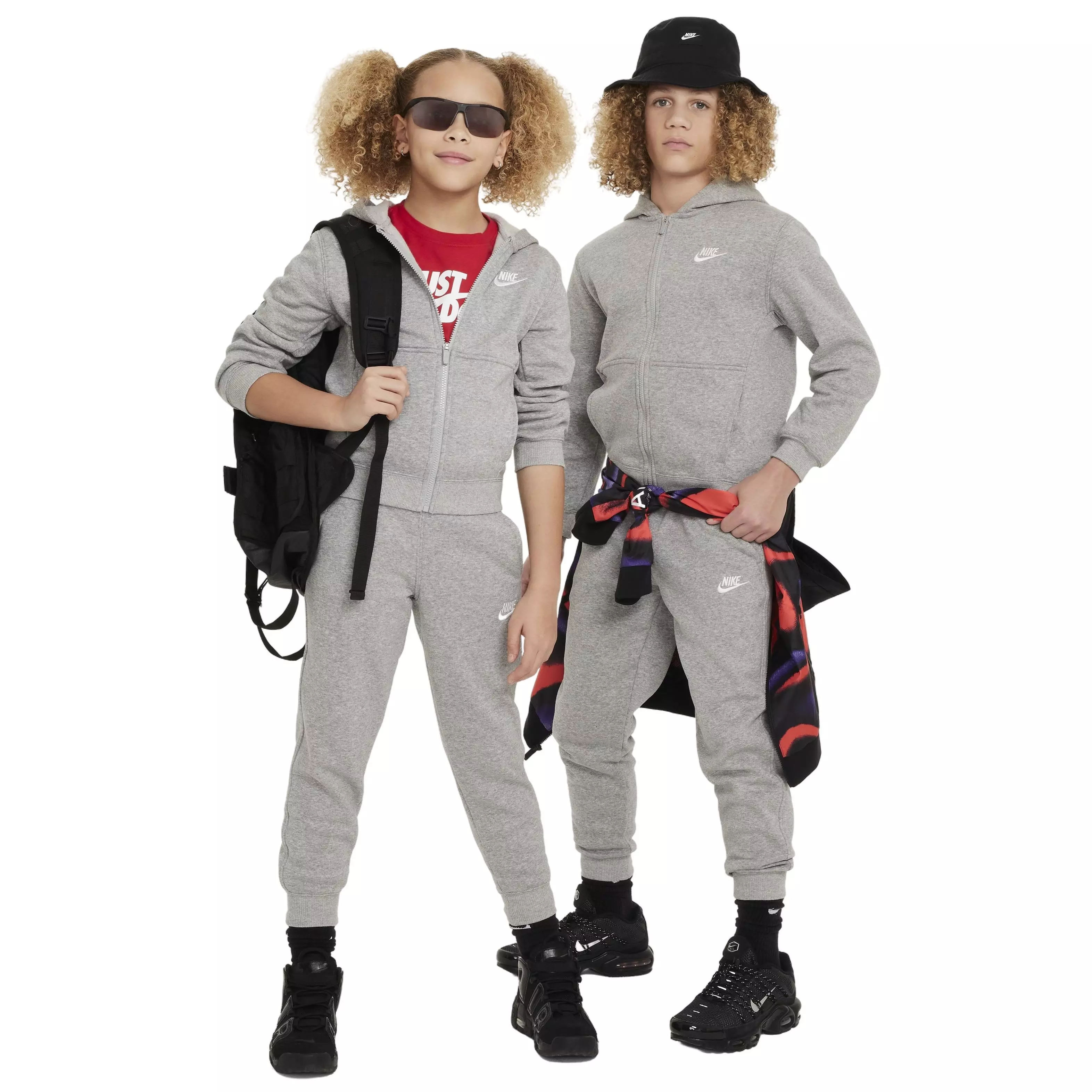 Take the guesswork out of getting ready with this fleece grey Nike Big Kids' Sportswear Club Fleece FZ Tracksuit. Smooth on the outside and brushed soft on the inside, this fleece is an easy layer when you want a little extra warmth. A powerhouse combo for playtime, you can rock this outfit with confidence or mix and match the pieces separately with your favorites throughout the week.Features