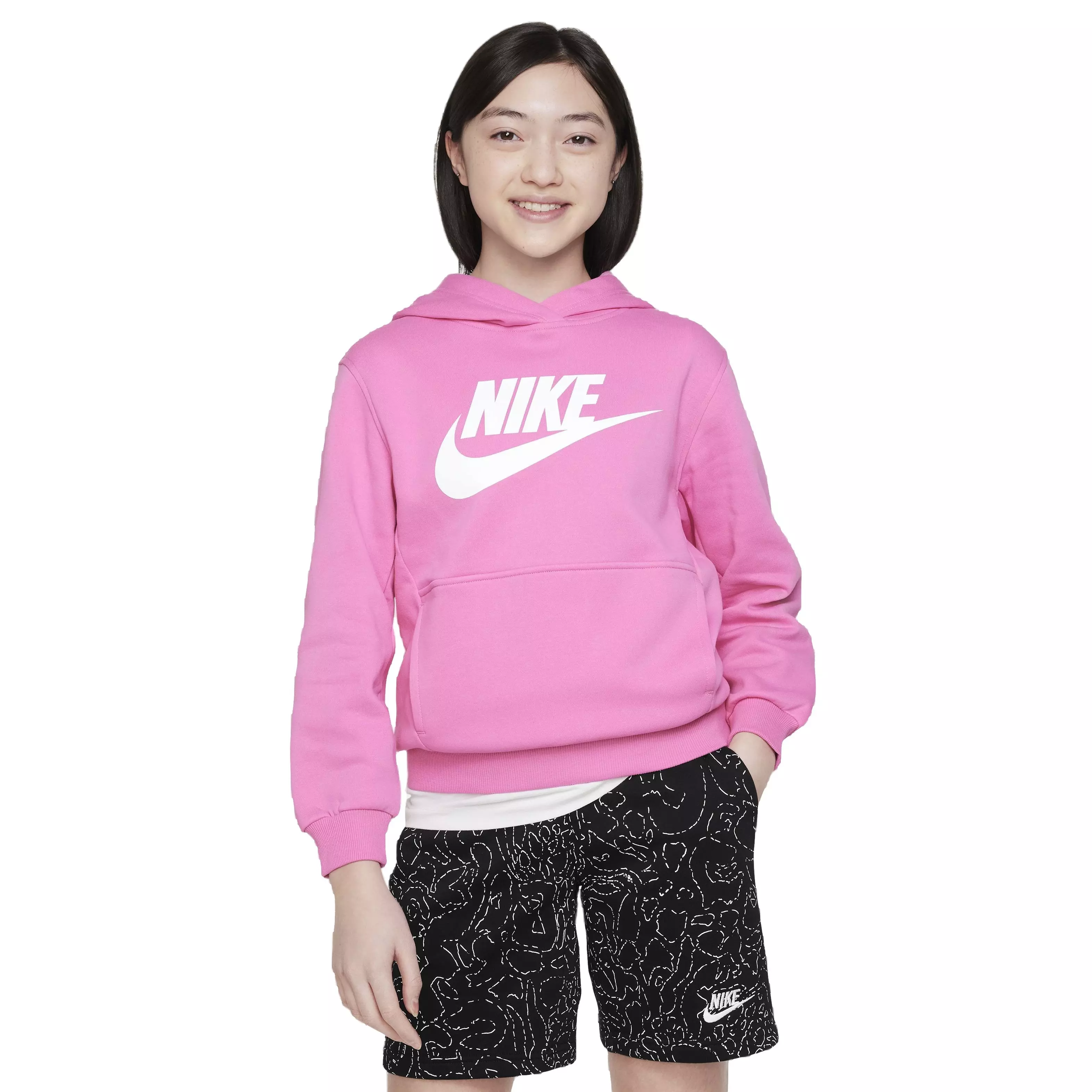Say hello to Club Fleece, an essential for running, jumping and laughing your way through the year. Smooth on the outside, brushed soft on the inside, this lightweight pink Nike Big Kids' Sportswear Club Fleece HBR Hoodie is an easy layer when you want a little extra warmth. Take chilly temps in stride with the help of this cozy pullover.Features