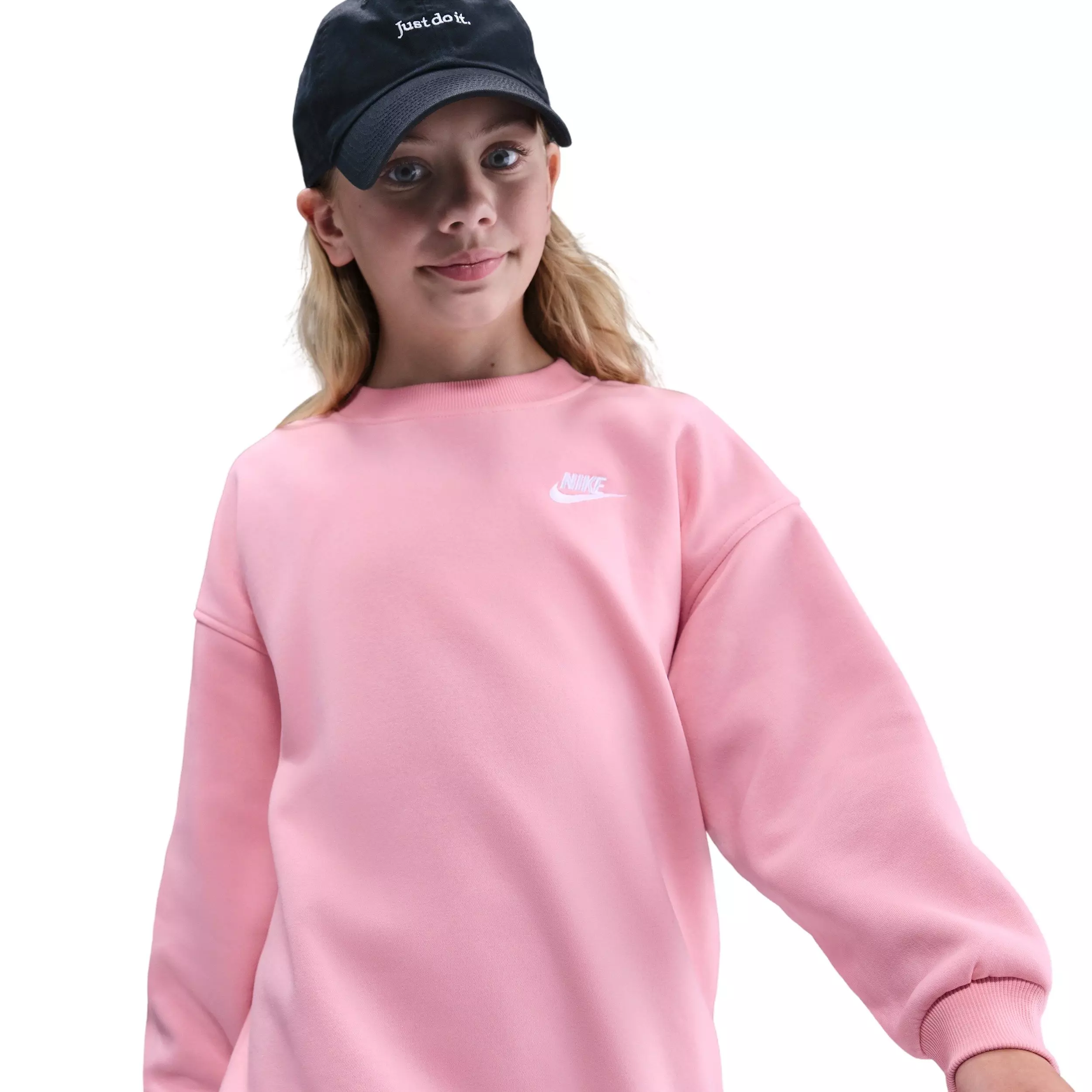 Cozy up in the Nike Big Kids' Sportswear Club Fleece Oversized Sweatshirt - Pink. Lightweight fleece feels smooth on the outside and brushed soft on the inside, delivering easy warmth for everyday wear and effortless layering.