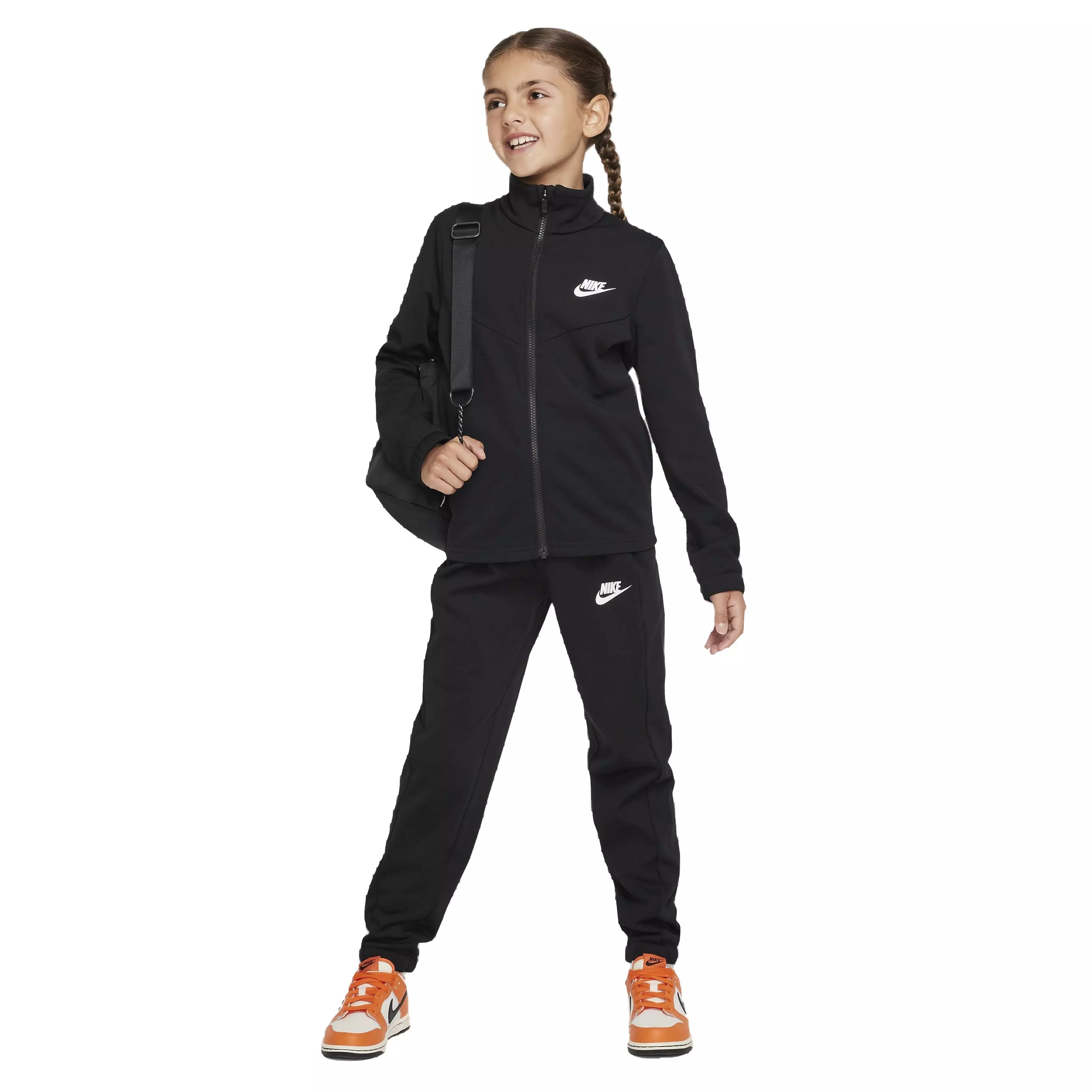 Get up and get going in a flash with the help of this matching black Nike Big Kids' Sportswear Poly Full-Zip HBR Tracksuit​. Smooth on the outside and brushed on the inside for added comfort, the cozy knit fabric delivers a classic tracksuit look and an extra soft feel. A subtle nod to Nike heritage, the v-shaped chevron design lines on the chest set you up with a classic Windrunner look.Features