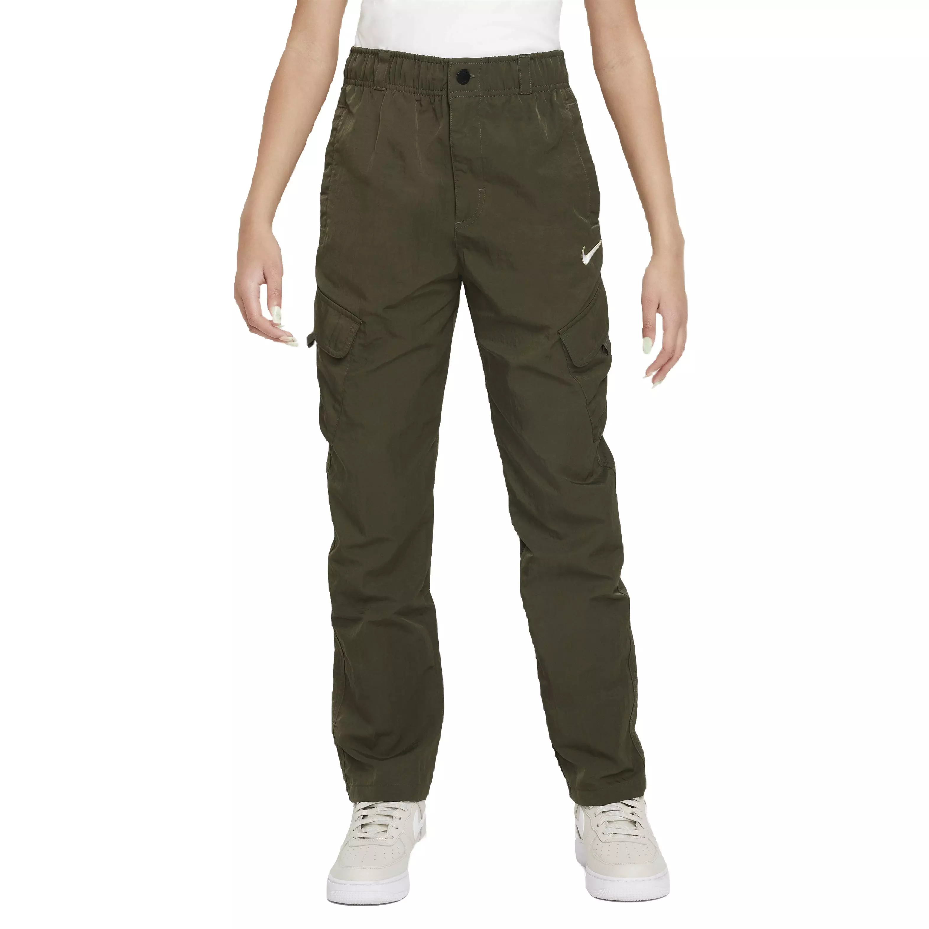 When you have more than you can carry, it's nice to have cargo pockets to store all your extra stuff. Smooth with a slightly structured feel, the lightweight woven fabric on these Nike Big Kids' Woven Cargo Pants - Green won't weigh you down on the playground—but all that stuff in your pockets might.Features